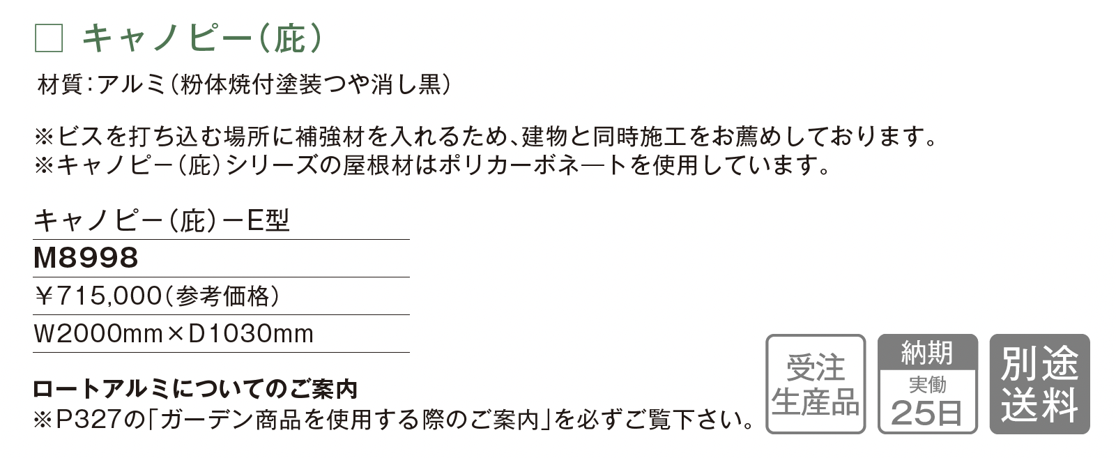 | 新旧品 | キャノピー(庇) E型【2025年版】(makeland All Items Catalog 2025-2026)キャノピー(庇) E型【2024年版】(makeland All Items Catalog 2024-2025) |