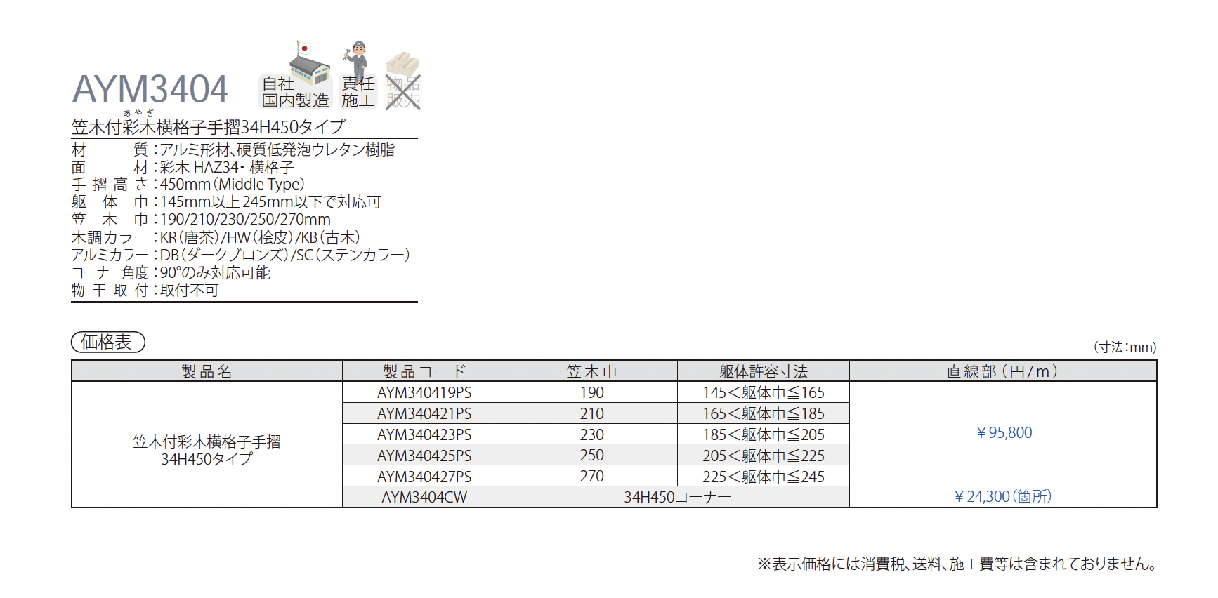 | 新旧品 | 笠木付彩木横格子手摺34H450タイプ AYM3404(彩木ウォール&エクステリア 528)笠木付彩木横格子手摺34H450タイプ【2024年版】(彩木ウォール&エクステリアカタログ【2024.4.14発刊】) |