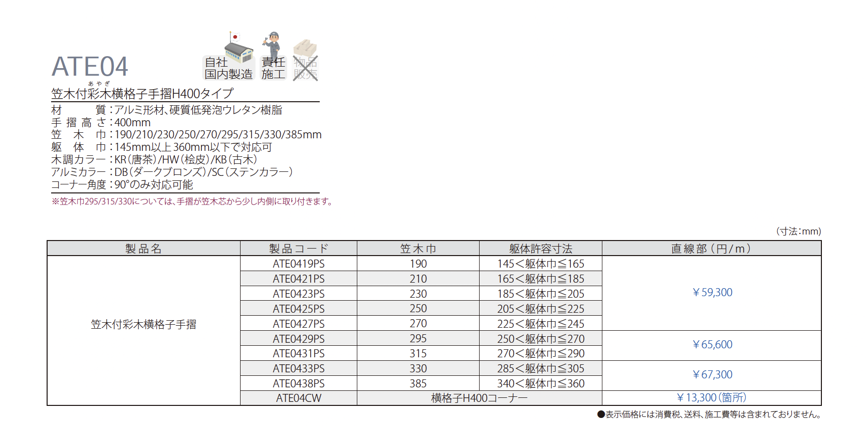 | 新旧品 | 笠木付彩木横格子手摺H400タイプ ATE04(彩木ウォール&エクステリア 528)笠木付彩木横格子手摺H400タイプ【2024年版】(彩木ウォール&エクステリアカタログ【2024.4.14発刊】) |
