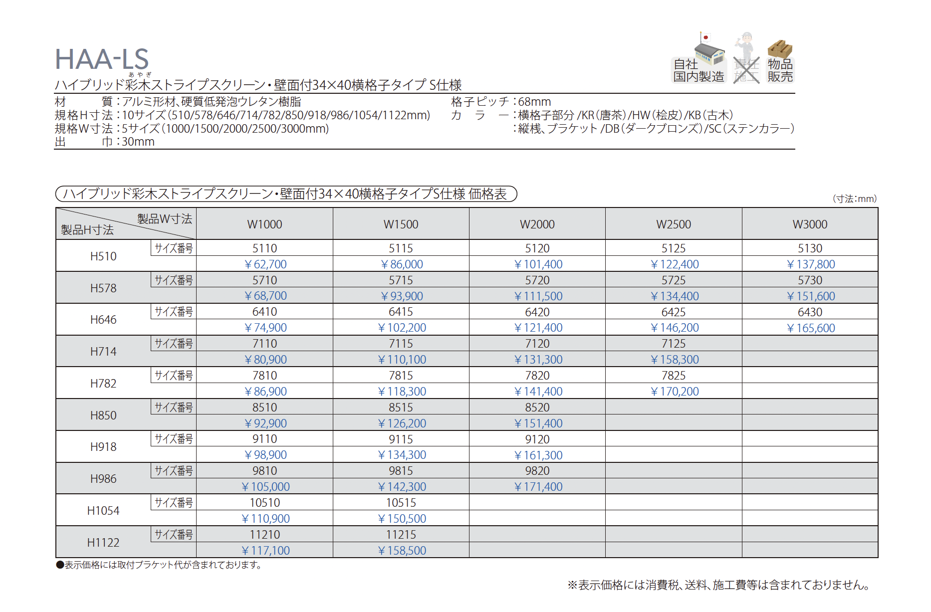 ハイブリッド彩木ストライプスクリーン・壁面付34×40横格子タイプ S仕様 HAA-LS