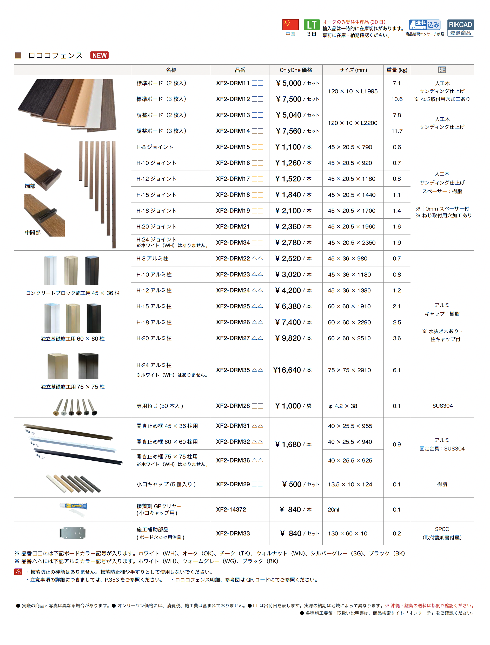 | 材質 | 人工木 サンディング仕上げ 樹脂 アルミ SUS304 SPCC |
