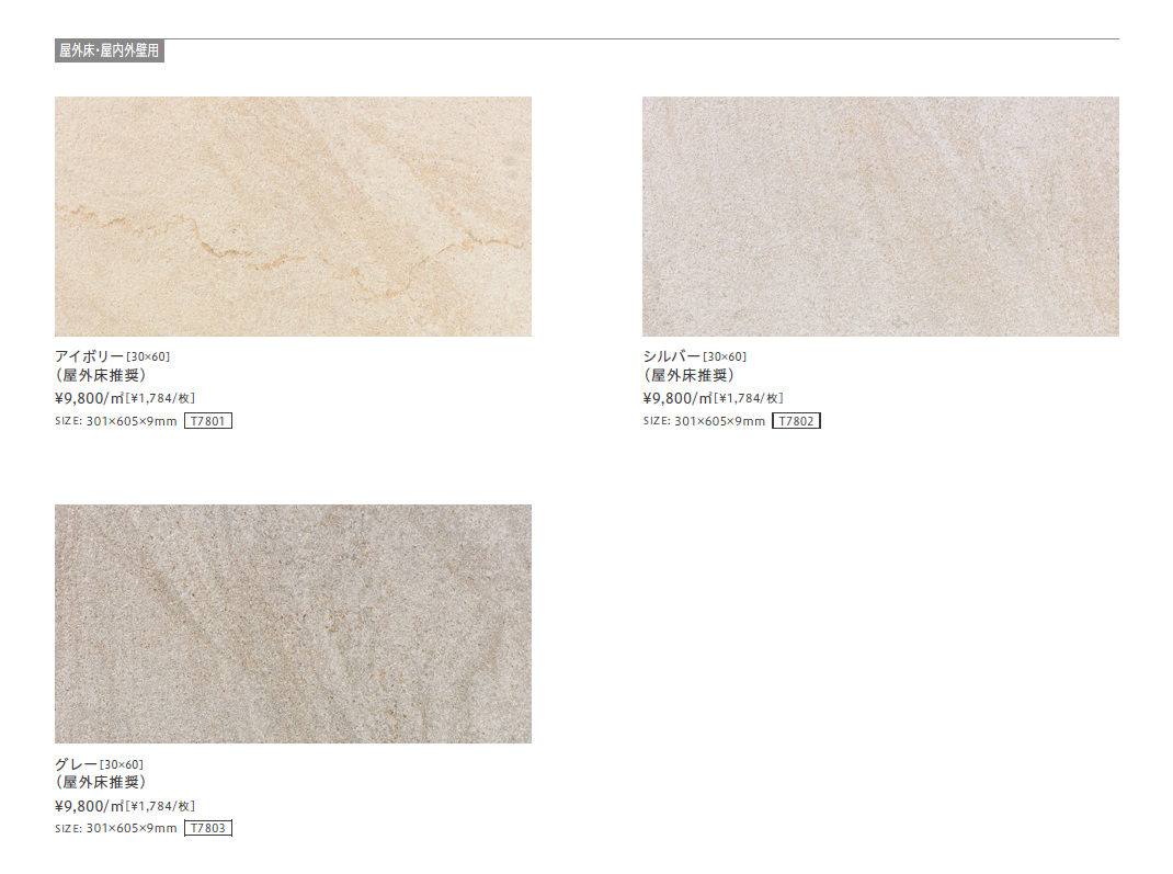 【屋外床・屋内外壁用】 ・住宅やビルなどの屋内壁部。リビング壁、ダイニング壁、キッチンバック、トイレ壁、店舗壁等の高さが比較的低い壁部。 ・住宅やビルなどの屋外壁部。(※上裏部は含みません) ・住宅やビルなどの屋外床部や、土足で歩行する雨水などの水濡れのある床部。住宅の玄関、マンションやビルのロビー等の屋内床も含む。 ・住宅やマンションなどの浴室床部。(※浴場・プールサイドでのご使用は別途ご相談ください) ・耐凍害性能を有し、寒冷地でも使用可能。 ・施工時の最小目地幅は5㎜以上です。施工の際は、この目地幅以上を取るようにしてください。 ・商品デザインの特性上、1枚ごとに色幅がります。色調のミックスにより美しい意匠となりますので、仮並べしてからの施工を推奨致します。 ・駅や空港等、歩行頻度の高い施設に施工可能。(※耐摩耗性試験( JIS A 1509-5/6)において、重歩行の基準となる摩耗体積175m㎥以下の結果のタイル)