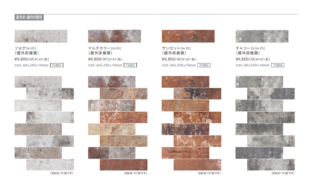 【屋外床・屋内外壁用】 ・住宅やビルなどの屋内壁部。リビング壁、ダイニング壁、キッチンバック、トイレ壁、店舗壁等の高さが比較的低い壁部。 ・住宅やビルなどの屋外壁部。(※上裏部は含みません) ・住宅やビルなどの屋外床部や、土足で歩行する雨水などの水濡れのある床部。住宅の玄関、マンションやビルのロビー等の屋内床も含む。 ・住宅やマンションなどの浴室床部。(※浴場・プールサイドでのご使用は別途ご相談ください) ・耐凍害性能を有し、寒冷地でも使用可能。 ・施工時の最小目地幅は5㎜以上です。施工の際は、この目地幅以上を取るようにしてください。 ・商品デザインの特性上、1枚ごとに色幅がります。色調のミックスにより美しい意匠となりますので、仮並べしてからの施工を推奨致します。