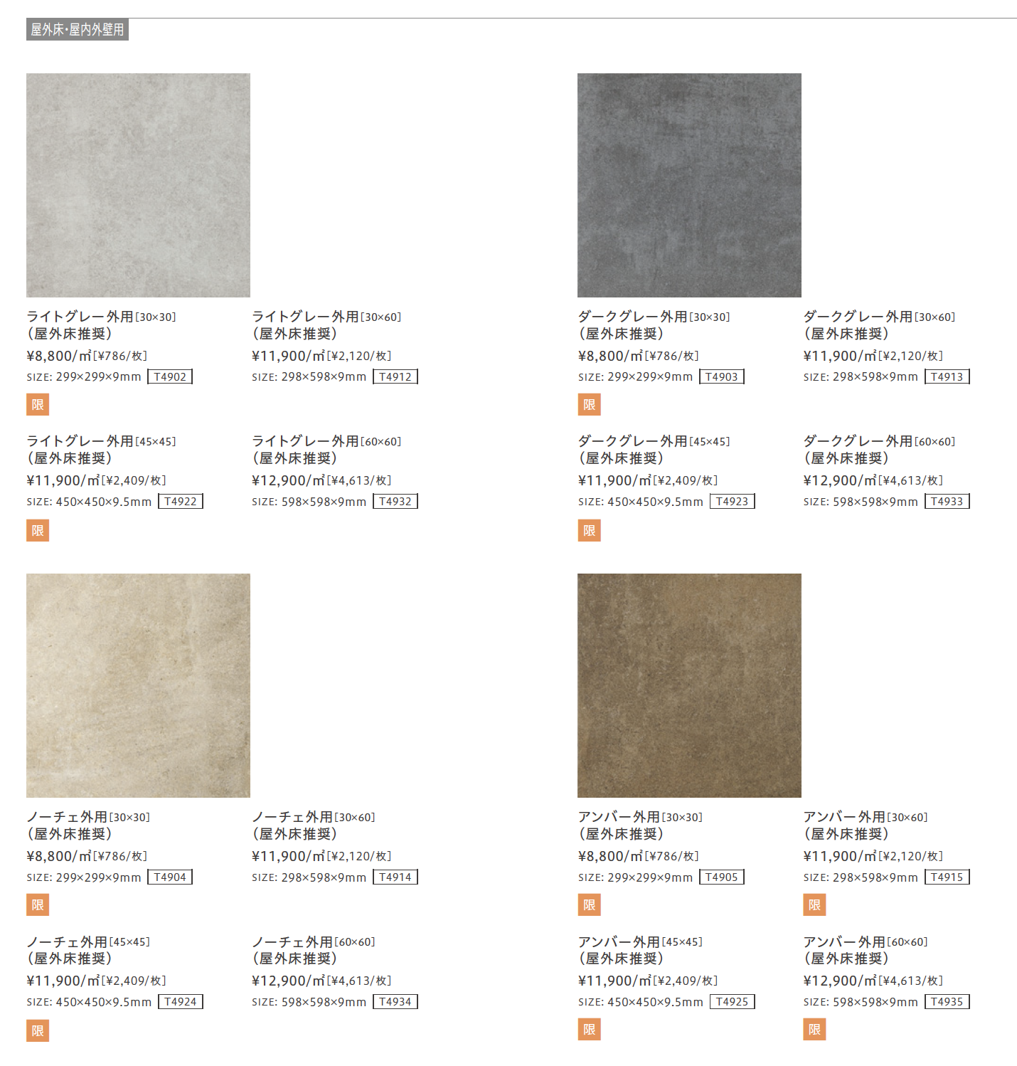 【共通】 ・住宅やビルなどの屋内壁部。リビング壁、ダイニング壁、キッチンバック、トイレ壁、店舗壁等の高さが比較的低い壁部。 ・住宅やビルなどの屋外壁部。(※上裏部は含みません) ・耐凍害性能を有し、寒冷地でも使用可能。 ・商品デザインの特性上、1枚ごとに色幅があります。色調のミックスにより美しい意匠となりますので、仮並べしてからの施工を推奨致します。 【屋外床・屋内外壁用】 ・施工時の最小目地幅は5㎜以上(30×30/45×45のライトグレー外用・ダークグレー外用・ノーチェ外用・アンバー外用) 3㎜以上(30×60/60×60のライトグレー外用・ダークグレー外用・ノーチェ外用・アンバー外用)です。 施工の際は、この目地幅以上を取るようにしてください。 ・住宅やビルなどの屋外床部や、土足で歩行する雨水などの水濡れのある床部。住宅の玄関、マンションやビルのロビー等の屋内床部も含む。 ・住宅やマンションなどの浴室床部。(※浴場・プールサイドでのご使用は別途ご相談ください) ・タイル焼成後、四方の側面を削って寸法精度を高めています。 同一ロット内の寸法のばらつきが少ないこと、側面の丸みが取れていることから細目地での施工が可能となります。 (※30×60/60×60のライトグレー外用・ダークグレー外用・ノーチェ外用・アンバー外用の場合) 【屋内床・屋内外壁用】 ・施工時の最小目地幅は3㎜以上(30×30/30×60/45×45のライトグレー磨き内用・アンバー磨き内用)です。 施工の際は、この目地幅以上を取るようにしてください。 ・住宅やビルなどの水濡れがない屋内床部。リビング床、ダイニング床、キッチン床、トイレ床、室内店舗床等雨水などの水濡れがない床部。 ・床暖房仕上げに対応出来る商品に表示しています。(※靴を脱いで上がる床を想定しています。靴履きの場所で使用する場合は別途ご相談ください) ・タイル焼成後、四方の側面を削って寸法精度を高めています。 同一ロット内の寸法のばらつきが少ないこと、側面の丸みが取れていることから細目地での施工が可能となります。 (※30×30/30×60/45×45のライトグレー磨き内用・アンバー磨き内用、30×60/60×60のライトグレーマット内用・ダークグレーマット内用・ノーチェマット内用・アンバーマット内用の場合)