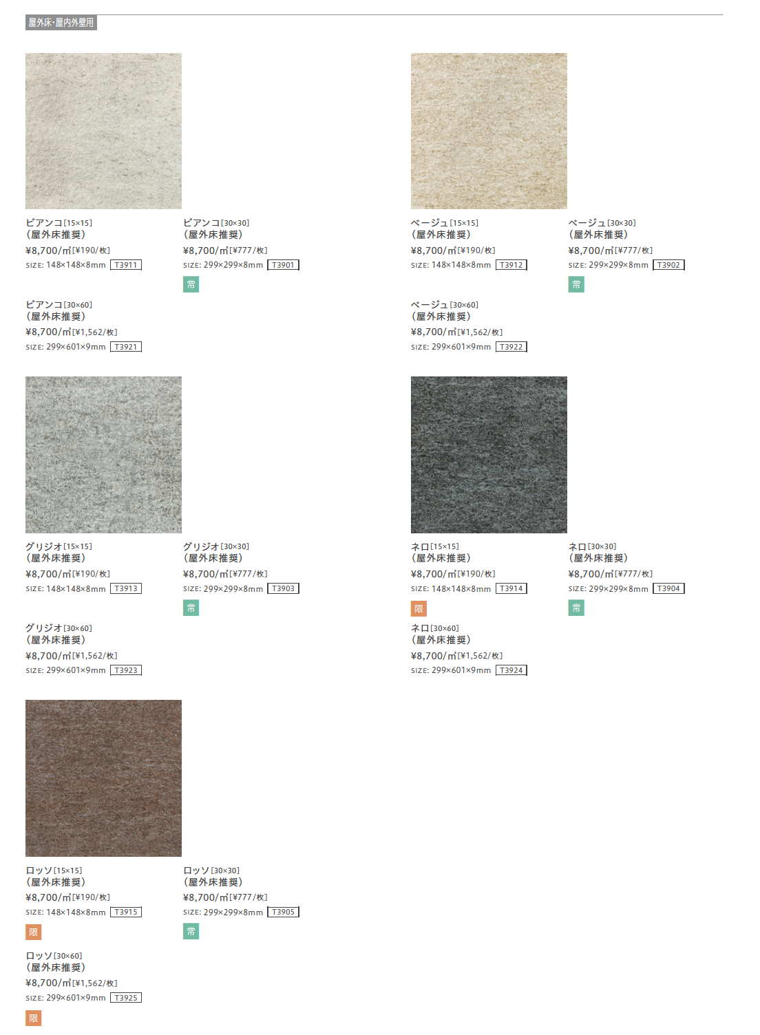 | 強度 | 曲げ強度:ISO 10545-4 63.1N/m㎡ 耐凍害性:ISO 10545-12 異常なし 耐薬品性:ISO 10545-13 異常なし |