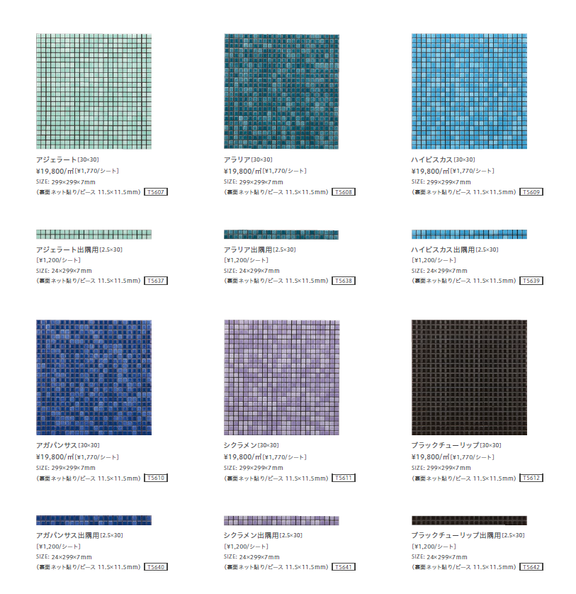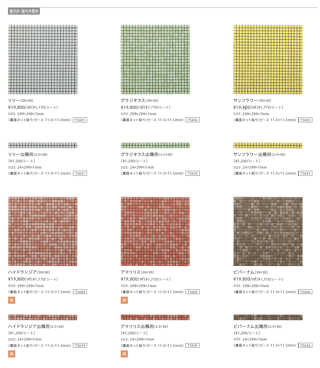 【屋内床・屋内外壁用】 ・住宅やビルなどの屋内壁部。リビング壁、ダイニング壁、キッチンバック、トイレ壁、店舗壁等の高さが比較的低い壁部。 ・住宅やビルなどの水濡れがない屋内床部。リビング床、ダイニング床、キッチン床、トイレ床、室内店舗床等雨水などの水濡れがない床部。 ・住宅やビルなどの屋外床部や、土足で歩行する雨水などの水濡れのある床部。住宅の玄関、マンションやビルのロビー等の屋内床部も含む。 ・床暖房仕上げに対応出来る商品に表示しています。(※靴を脱いで上がる床を想定しています。靴履きの場所で使用する場合は別途ご相談ください) ・耐凍害性能を有し、寒冷地でも使用可能。 ・施工時の最小目地幅は1㎜以上です。施工の際は、この目地幅以上を取るようにしてください。 ・商品デザインの特性上、1枚ごとに色幅があります。色調のミックスにより美しい意匠となりますので、仮並べしてからの施工を推奨致します。