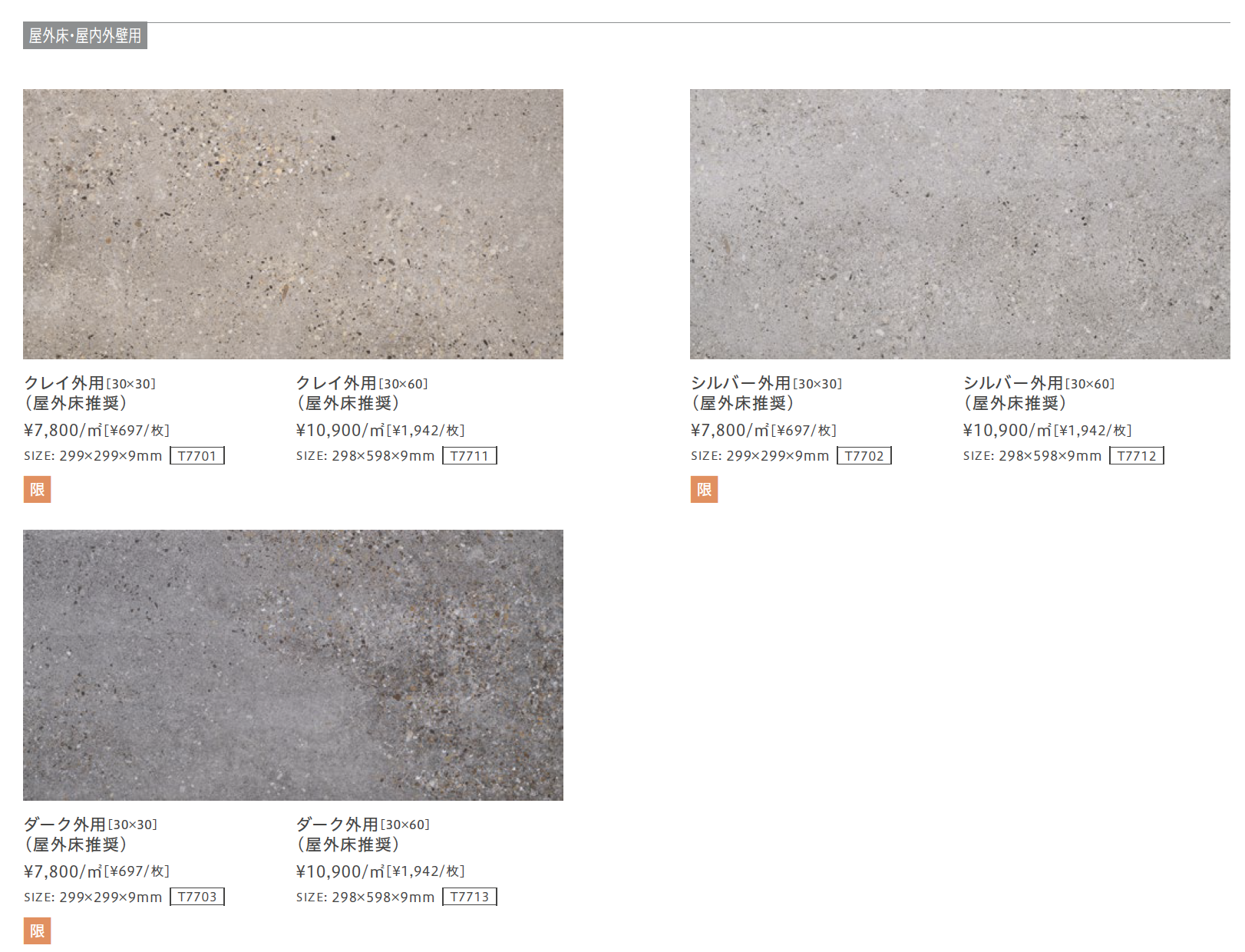 【屋外床・屋内外壁用】 ・住宅やビルなどの屋内壁部。リビング壁、ダイニング壁、キッチンバック、トイレ壁、店舗壁等の高さが比較的低い壁部。 ・住宅やビルなどの屋外壁部。(※上裏部は含みません) ・住宅やビルなどの屋外床部や、土足で歩行する雨水などの水濡れのある床部。住宅の玄関、マンションやビルのロビー等の屋内床も含む。 ・住宅やマンションなどの浴室床部。(※浴場・プールサイドでのご使用は別途ご相談ください) ・耐凍害性能を有し、寒冷地でも使用可能。 ・施工時の最小目地幅は5㎜以上(30×30のクレイ外用・シルバー外用・ダーク外用)/3㎜以上(30×60のクレイ外用・シルバー外用・ダーク外用)です。 施工の際は、この目地幅以上を取るようにしてください。 ・駅や空港等、歩行頻度の高い施設に施工可能。(※耐摩耗性試験( JIS A 1509-5/6)において、重歩行の基準となる摩耗体積175m㎥以下の結果のタイル) ・タイル焼成後、四方の側面を削って寸法精度を高めています。 同一ロット内の寸法のばらつきが少ないこと、側面の丸みが取れていることから細目地での施工が可能となります。(※30×60の場合)