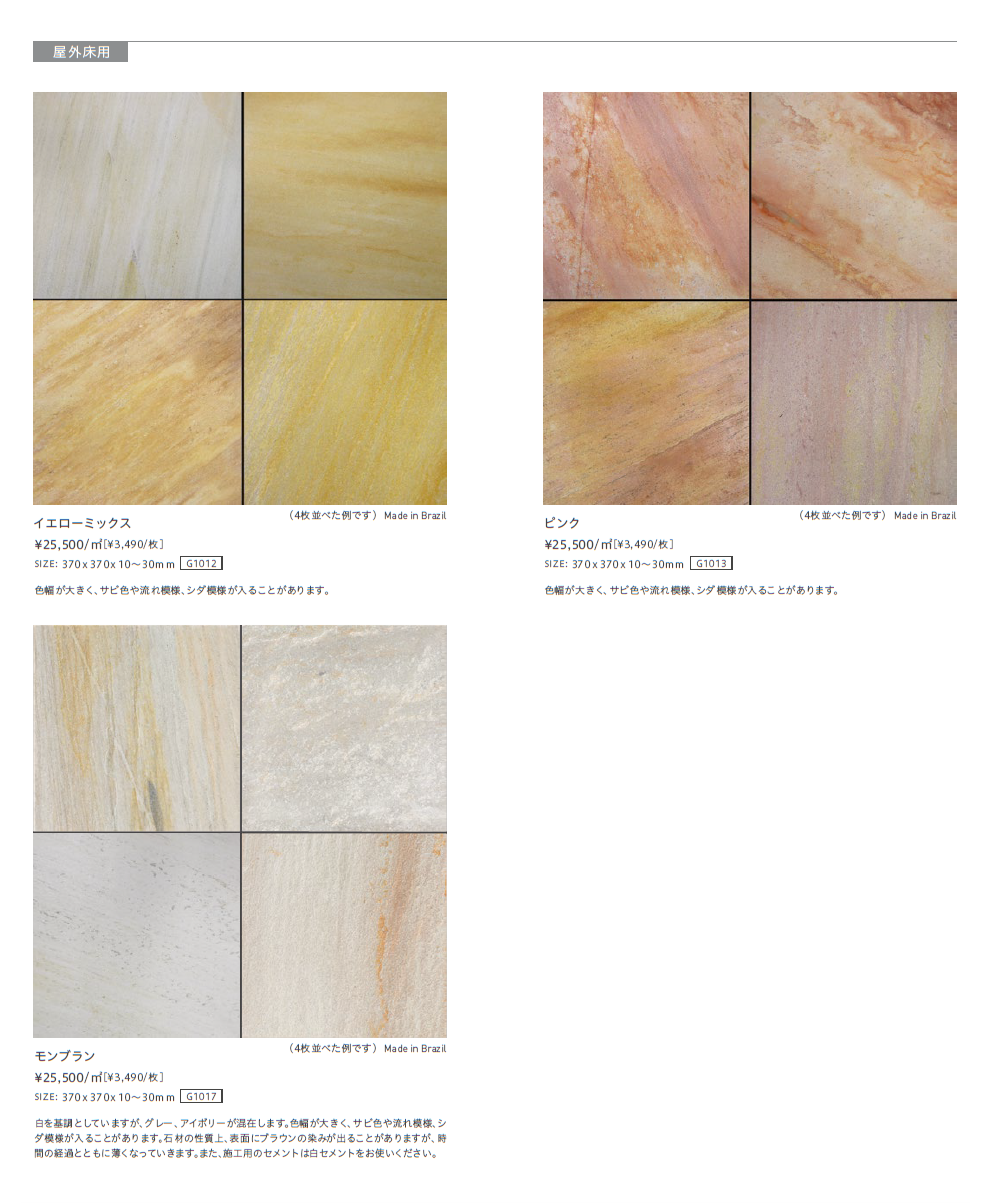 【屋外床用】 ・住宅やビルなどの屋内壁部。リビング壁、ダイニング壁、キッチンバック、トイレ壁、店舗壁等の高さが比較的低い壁部。 ・住宅やビルなどの屋外床部や、土足で歩行する雨水などの水濡れのある床部。住宅の玄関、マンションやビルのロビー等の屋内床部も含む。 ・住宅やビルなどの屋外壁部。(※上裏部は含みません) ・住宅やマンションなどの浴室床部。(※浴場・プールサイドでのご使用は別途ご相談ください) ・施工時の最小目地幅は10㎜以上です。施工の際は、この目地幅以上を取るようにしてください。 ・商品デザインの特性上、1枚ごとに色幅があります。色調のミックスにより美しい意匠となりますので、仮並べしてからの施工を推奨致します。 ・駅や空港等、歩行頻度の高い施設に施工可能。(※耐摩耗性試験( JIS A 1509-5/6)において、重歩行の基準となる摩耗体積175m㎥以下の結果のタイル)