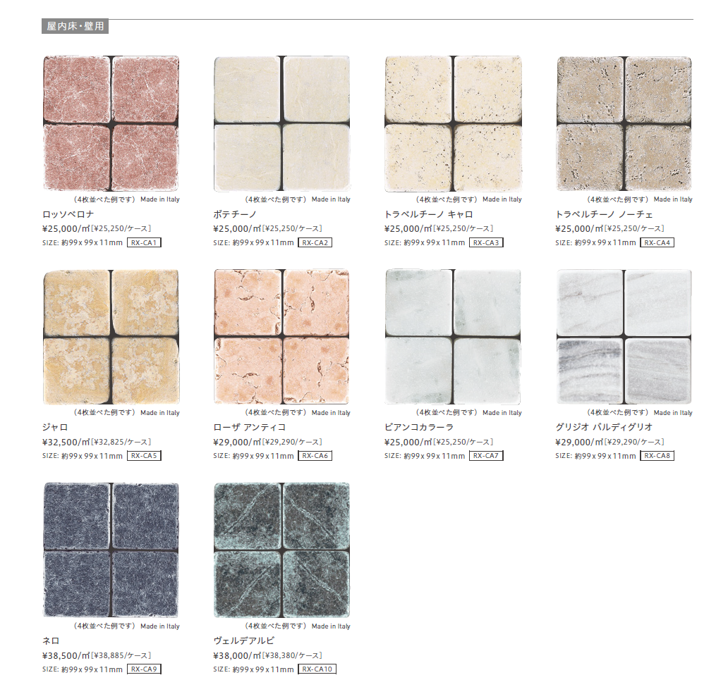 | カラー | ロッソベローナ ボテチーノ トラベルチーノ ノーチェ ジャロ ローザアンティコ ビアンコカラーラ グリジオバルディグリオ ネロ ヴェルデアルビ トラベルチーノ キャロ |