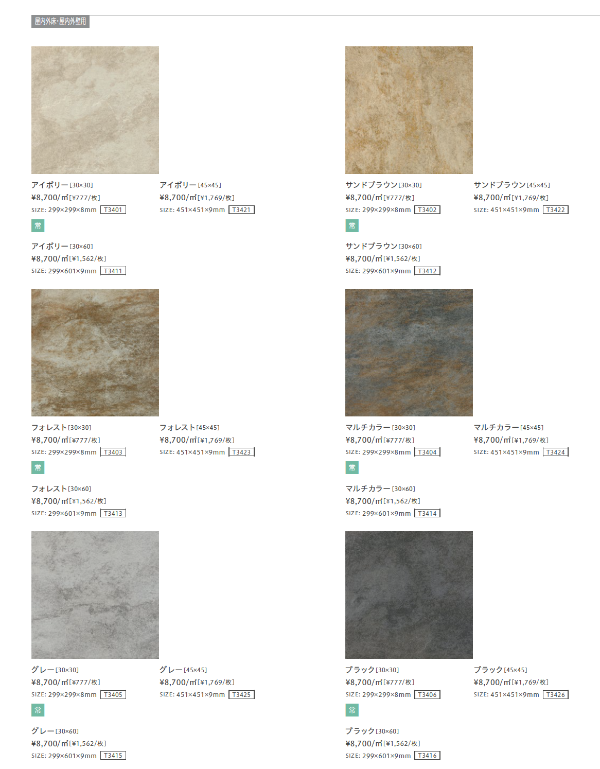 【屋内外床・屋内外壁用】 ・住宅やビルなどの屋内壁部。リビング壁、ダイニング壁、キッチンバック、トイレ壁、店舗壁等の高さが比較的低い壁部。 ・住宅やビルなどの水濡れがない屋内床部。リビング床、ダイニング床、キッチン床、トイレ床、室内店舗床等雨水などの水濡れがない床部。 ・住宅やビルなどの屋外床部や、土足で歩行する雨水などの水濡れのある床部。住宅の玄関、マンションやビルのロビー等の屋内床部も含む。 ・住宅やビルなどの屋外壁部。(※上裏部は含みません) ・住宅やマンションなどの浴室床部。(※浴場・プールサイドでのご使用は別途ご相談ください) ・床暖房仕上げに対応出来る商品に表示しています。(※靴を脱いで上がる床を想定しています。靴履きの場所で使用する場合は別途ご相談ください) ・耐凍害性能を有し、寒冷地でも使用可能。 ・施工時の最小目地幅は5㎜以上です。施工の際は、この目地幅以上を取るようにしてください。 ・商品デザインの特性上、1枚ごとに色幅があります。色調のミックスにより美しい意匠となりますので、仮並べしてからの施工を推奨致します。 ・ペットがすべりにくい屋内床タイル商品に表示しています。