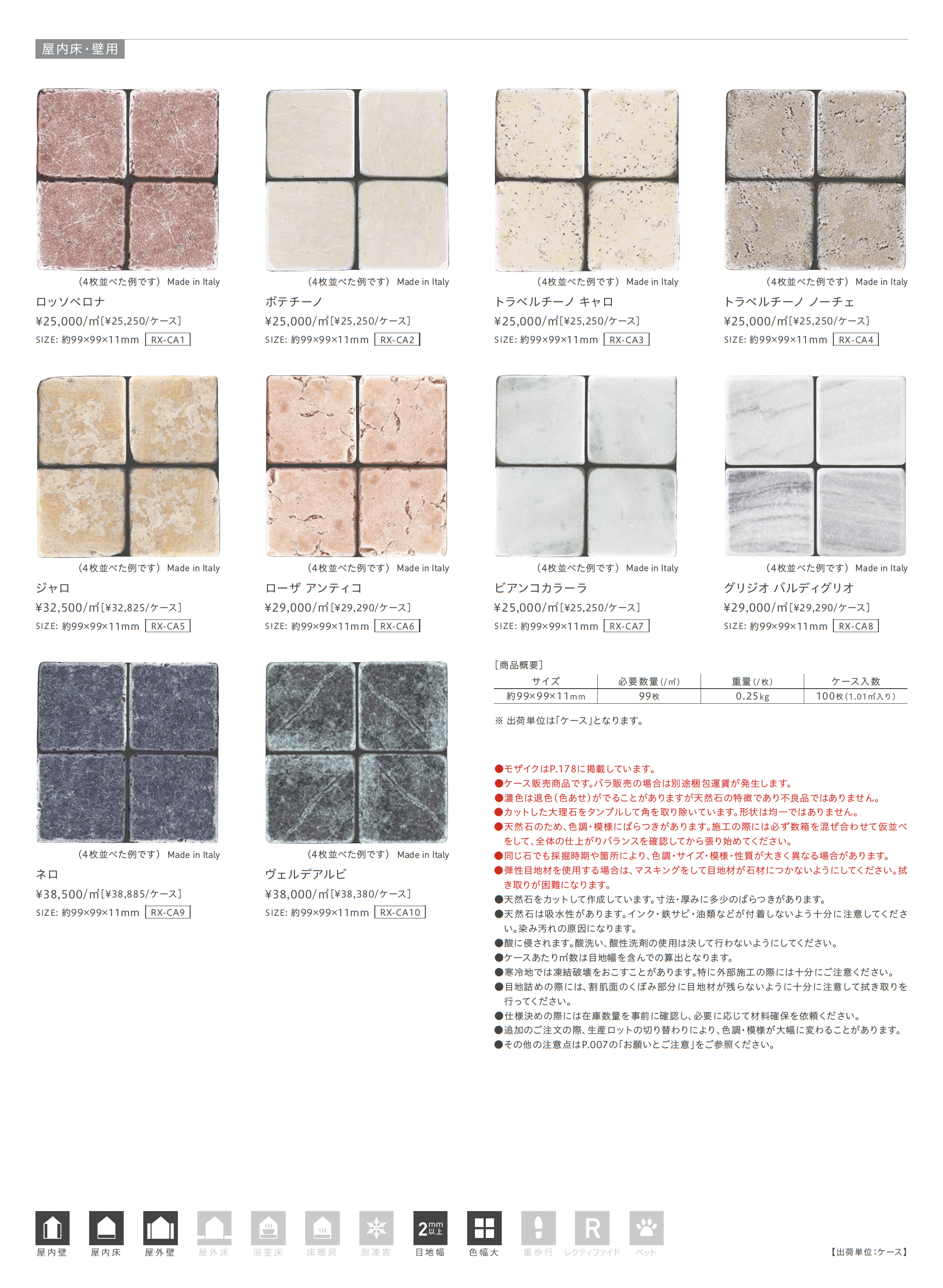 | カラー | ロッソベロナ ボテチーノ トラベルチーノ キャロ トラベルチーノ ノーチェ ジャロ ローザアンティコ ビアンコカラーラ グリジオ バルディグリオ ネロ ヴェルデアルビ |