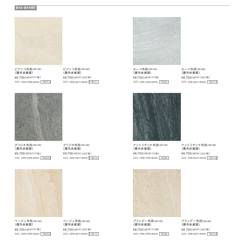 【屋外床・屋内外壁用】 ・住宅やビルなどの屋内壁部。リビング壁、ダイニング壁、キッチンバック、トイレ壁、店舗壁等の高さが比較的低い壁部。 ・住宅やビルなどの屋外壁部。(※上裏部は含みません) ・住宅やビルなどの屋外床部や、土足で歩行する雨水などの水濡れのある床部。住宅の玄関、マンションやビルのロビー等の屋内床も含む。 ・住宅やマンションなどの浴室床部。(※浴場・プールサイドでのご使用は別途ご相談ください) ・耐凍害性能を有し、寒冷地でも使用可能。 ・施工時の最小目地幅は5㎜以上です。施工の際は、この目地幅以上を取るようにしてください。 ・商品デザインの特性上、1枚ごとに色幅がります。色調のミックスにより美しい意匠となりますので、仮並べしてからの施工を推奨致します。 ・駅や空港等、歩行頻度の高い施設に施工可能。(※耐摩耗性試験( JIS A 1509-5/6)において、重歩行の基準となる摩耗体積175m㎥以下の結果のタイル)