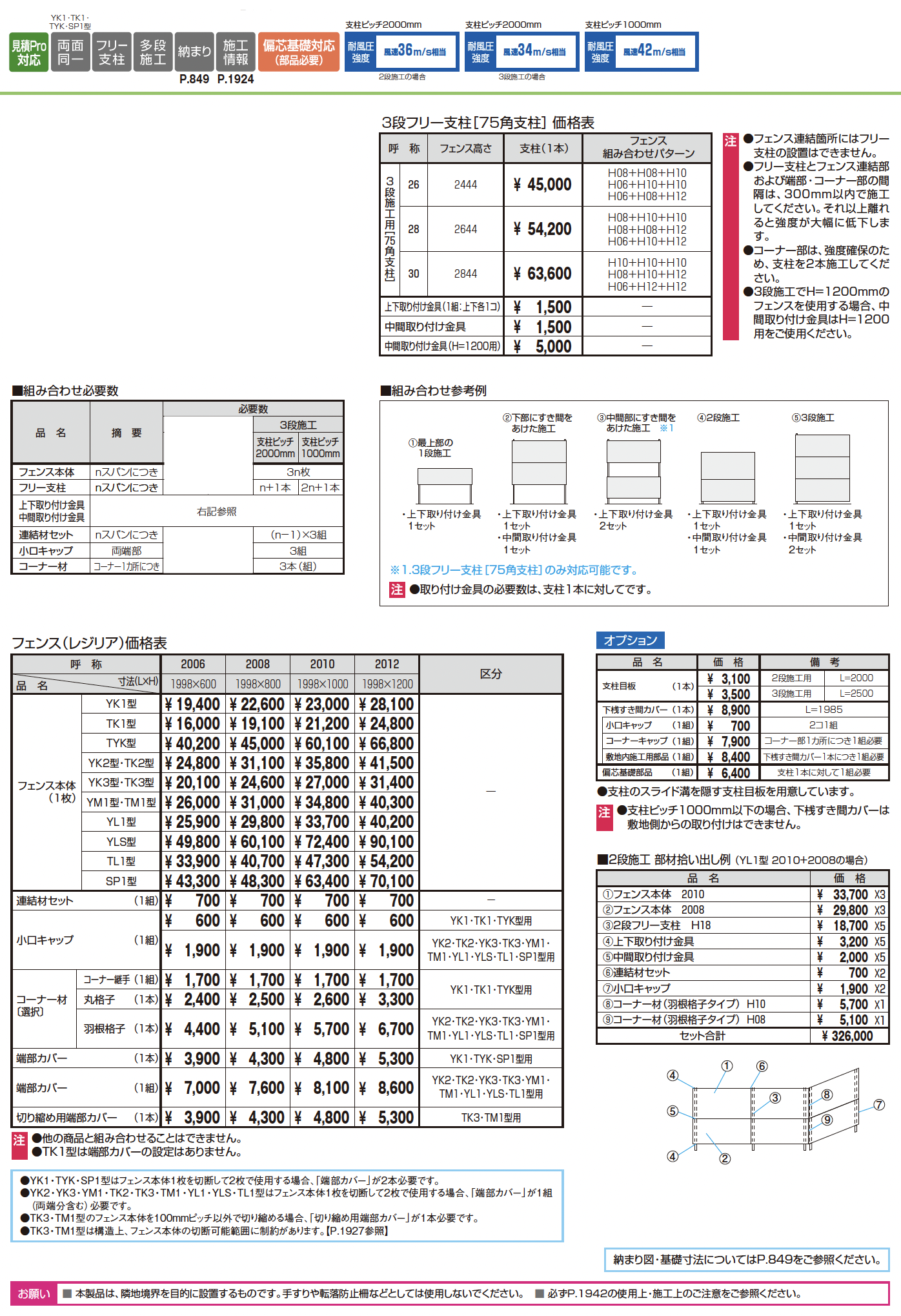 見積りシステム対応、両面同一(YK1・TK1・ TYK・SP1型)、フリー支柱、多段施工、偏芯基礎対応(部品必要)