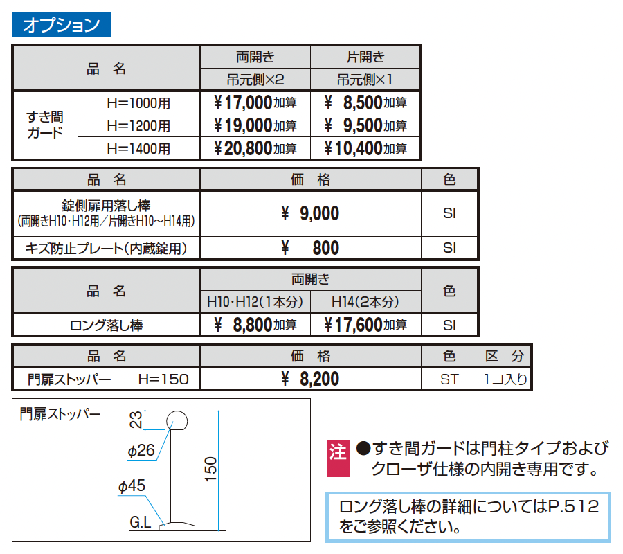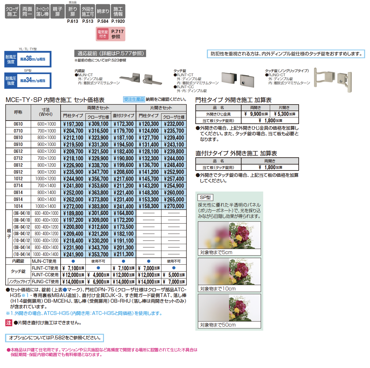 クローザ施工、両面同一、オートロック落し棒、親子扉、折り扉(受注品)、外開き施工