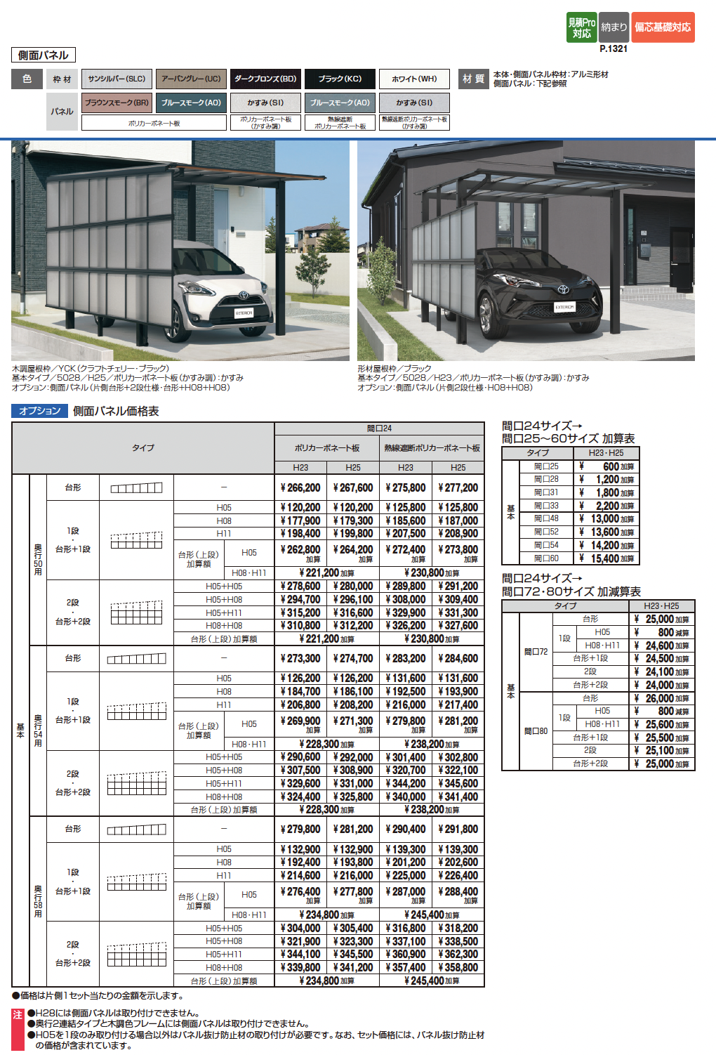 見積りシステム対応、奥行連結、ハイルーフ車(H:2300を除く)、ロング柱(H:2800)、側面パネル(H:2800を除く)、偏芯基礎対応