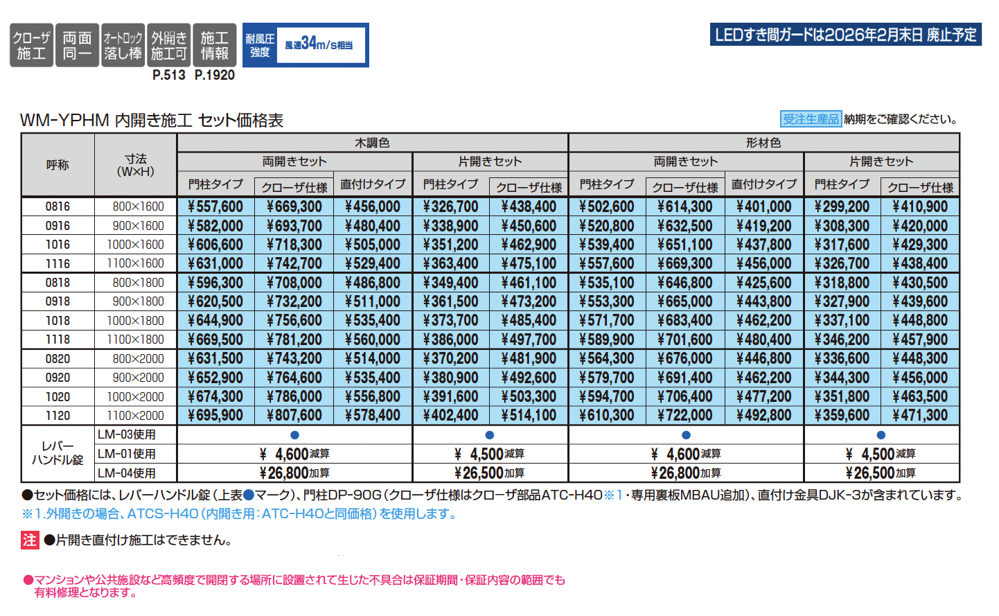 クローザ施工、両面同一、オートロック落し棒、外開き施工