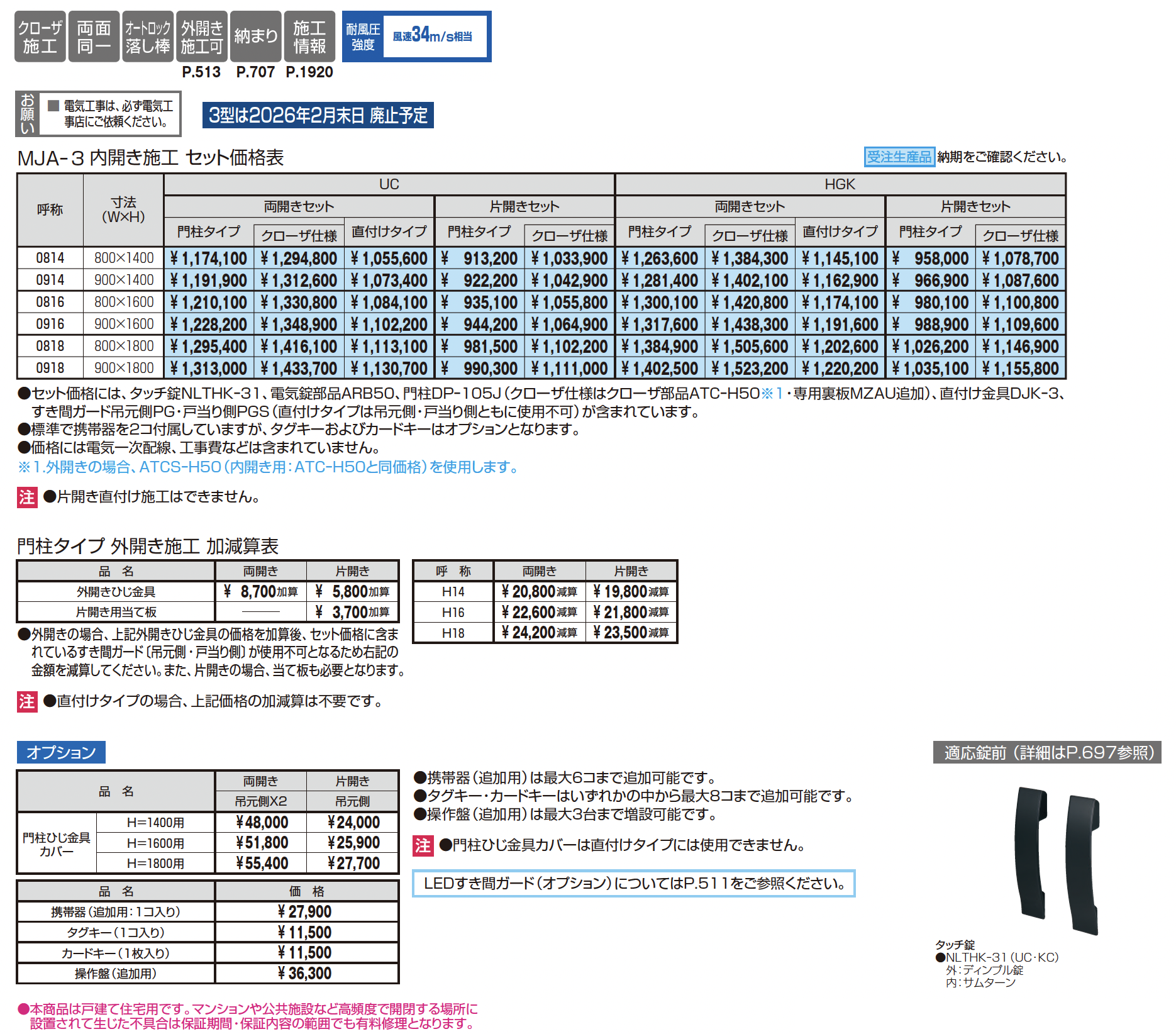 クローザ施工、両面同一、オートロック落し棒、外開き施工