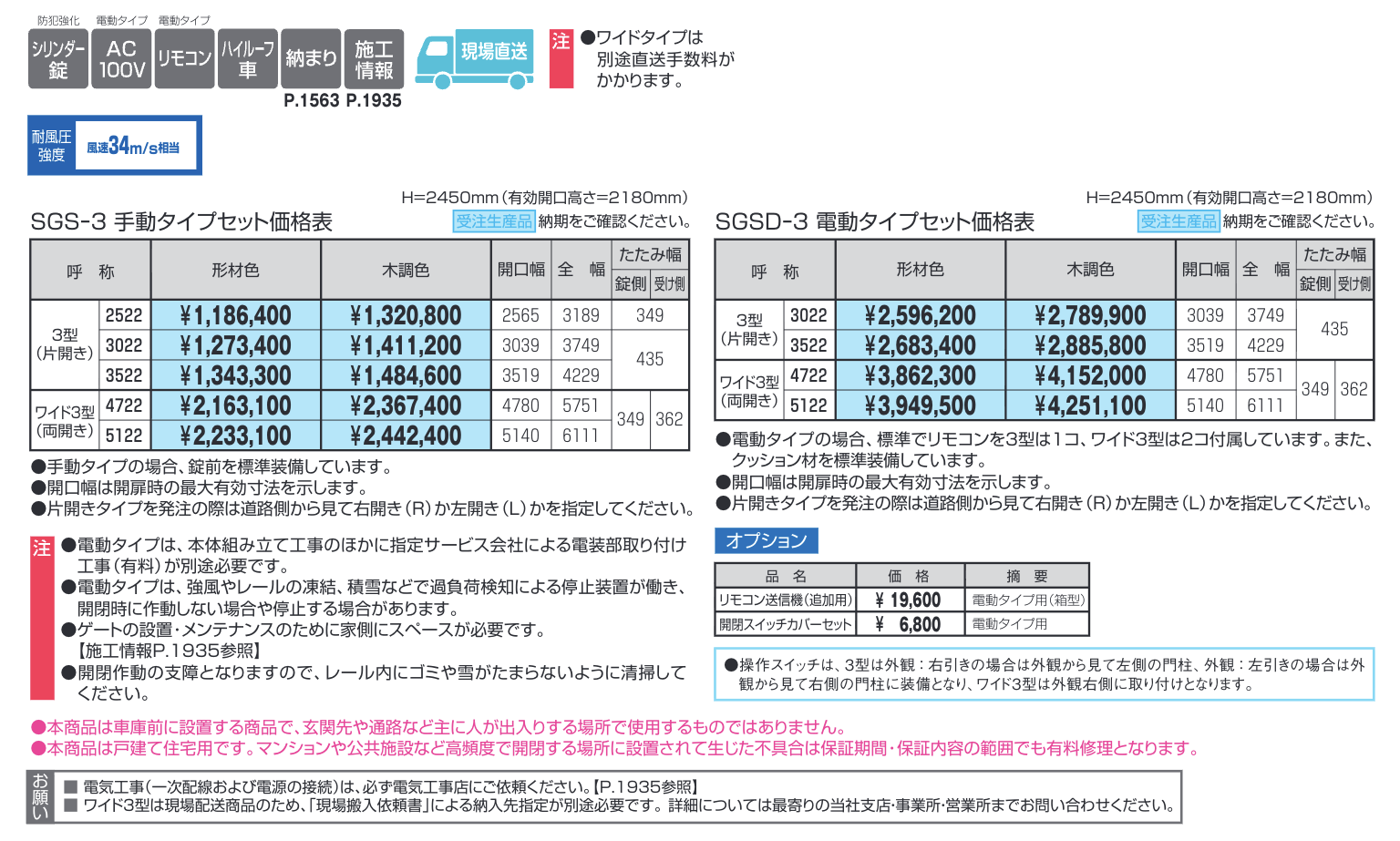 シリンダー錠(防犯強化)、AC100V(電動タイプ)、リモコン(電動タイプ)、ハイルーフ車