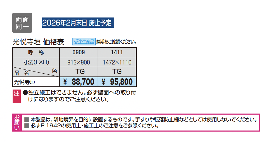 新旧品 | 紗更 光悦寺垣(エクステリア 総合カタログ 2025-2026)紗更 光悦寺垣【2024年版】(エクステリア 総合カタログ 2024-2025)紗更 光悦寺垣【2022年版】(エクステリア 総合カタログ 2022-2023(2022年11月価格改定版))紗更 光悦寺垣【2023年版】(エクステリア 総合カタログ 2023-2024) |