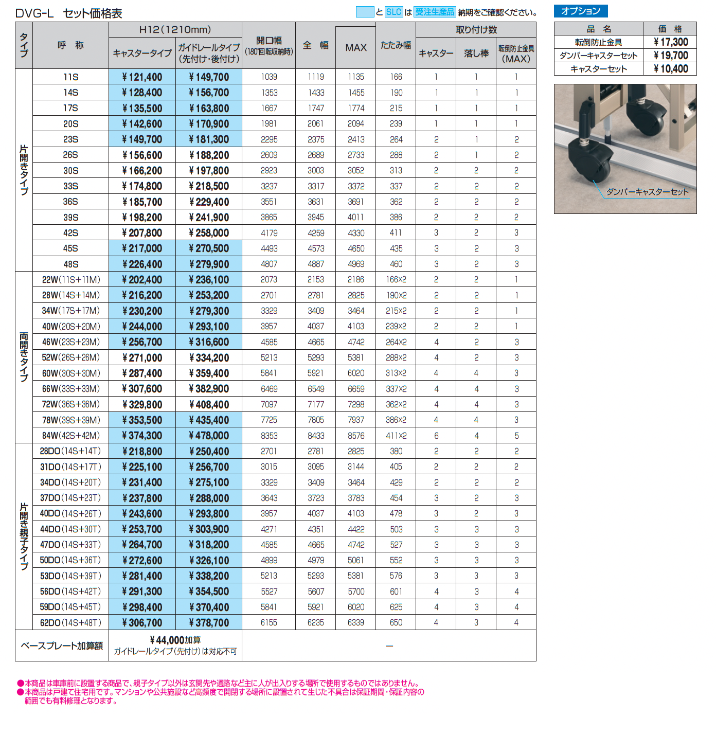 シリンダー錠、両面同一、親子扉、ダブルキャスター、ストッパー、揺れ止めラッチ(標準装備)、角地施工