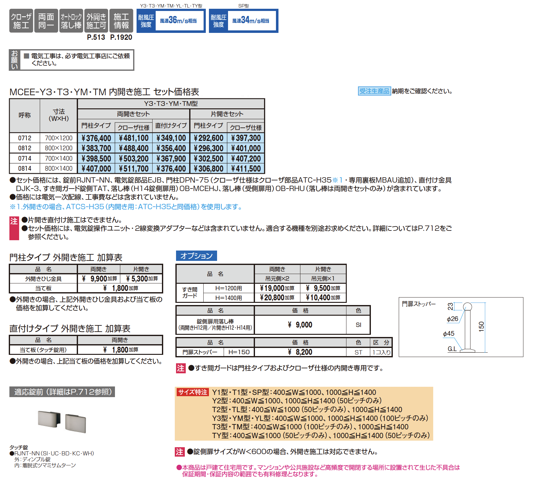 クローザ施工、両面同一、オートロック落し棒、外開き施工