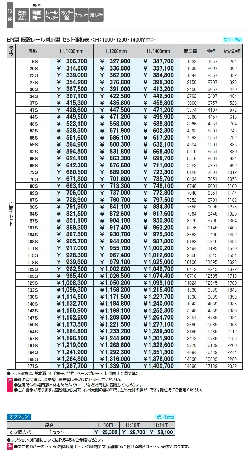 | 新旧品 | 既設レール対応型 アルテンダEN型 レールタイプ(パブリックエクステリア 総合カタログ2025-2026(2025年10月価格改訂版))既設レール対応型 アルテンダEN型 レールタイプ(パブリックエクステリア 総合カタログ 2024)既設レール対応型 アルテンダEN型 レールタイプ 【2022年版】(パブリックエクステリア 総合カタログ 2022-2023(2022年11月価格改定版)) |