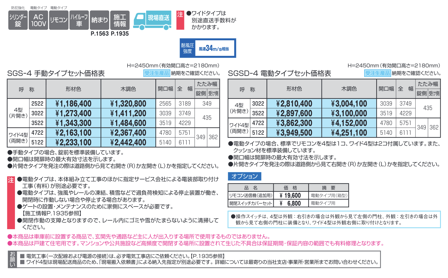 シリンダー錠(防犯強化)、AC100V(電動タイプ)、リモコン(電動タイプ)、ハイルーフ車