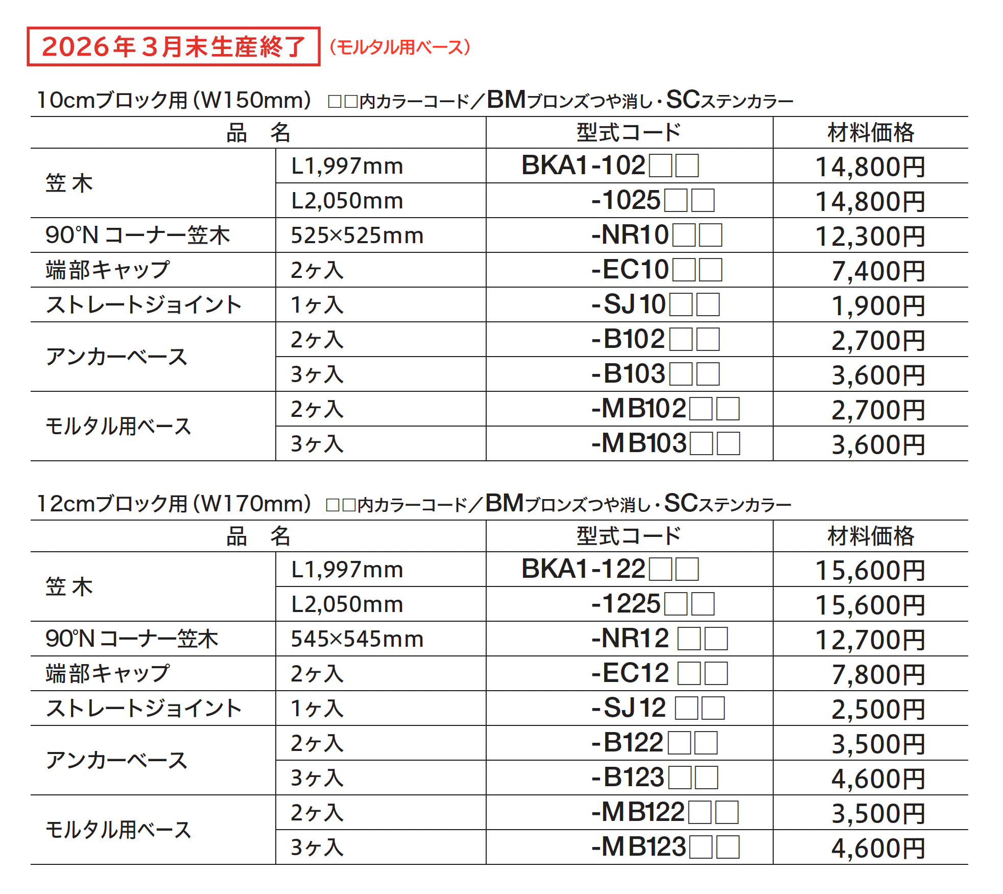 | カラー | BM:ブロンズつや消し SC:ステンカラー |