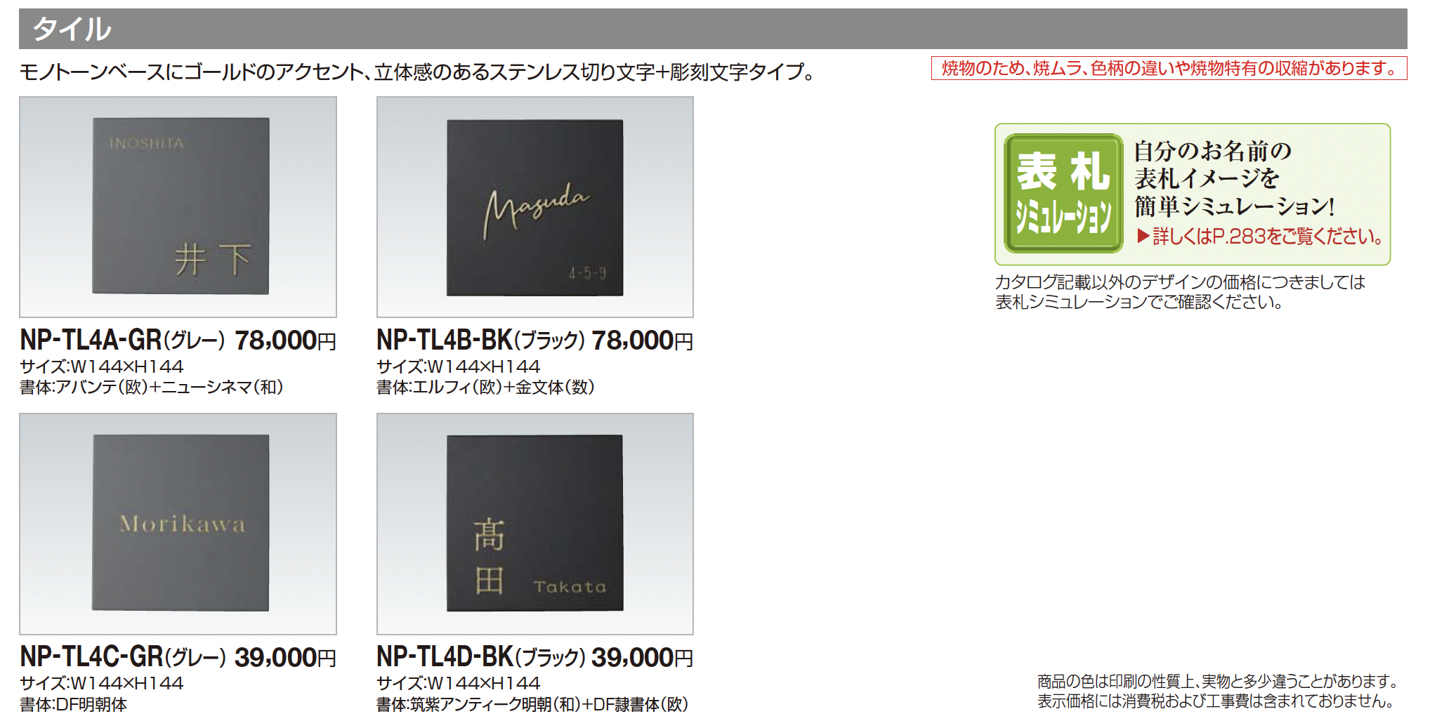 | 新旧品 | 表札(タイル) 【2025年版】(エクステリア総合カタログ 2025年度版)表札(タイル) 2024年6月発売【2024年版】(エクステリア総合カタログ 2024年度版) |