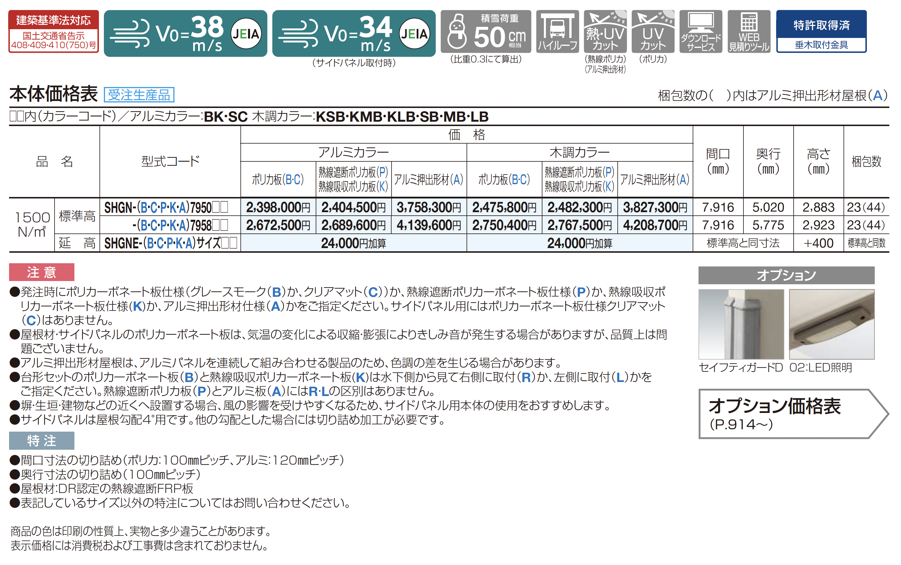| カラー | SC:ステンカラー KSB:BK+セピアブラウン KMB:BK+マロンブラウン KLB:BK+ライトブラウン BK:ブラックつや消し SB:SC+セピアブラウン MB:SC+マロンブラウン LB:SC+ライトブラウン B:ポリカ板(グレースモーク) P:熱線遮断ポリカ板(グレースモーク) C:ポリカ板(クリアマット) K:熱線吸収ポリカ板(クリア片面マット) A:アルミ押出形材(不燃材)(ステンカラー) |