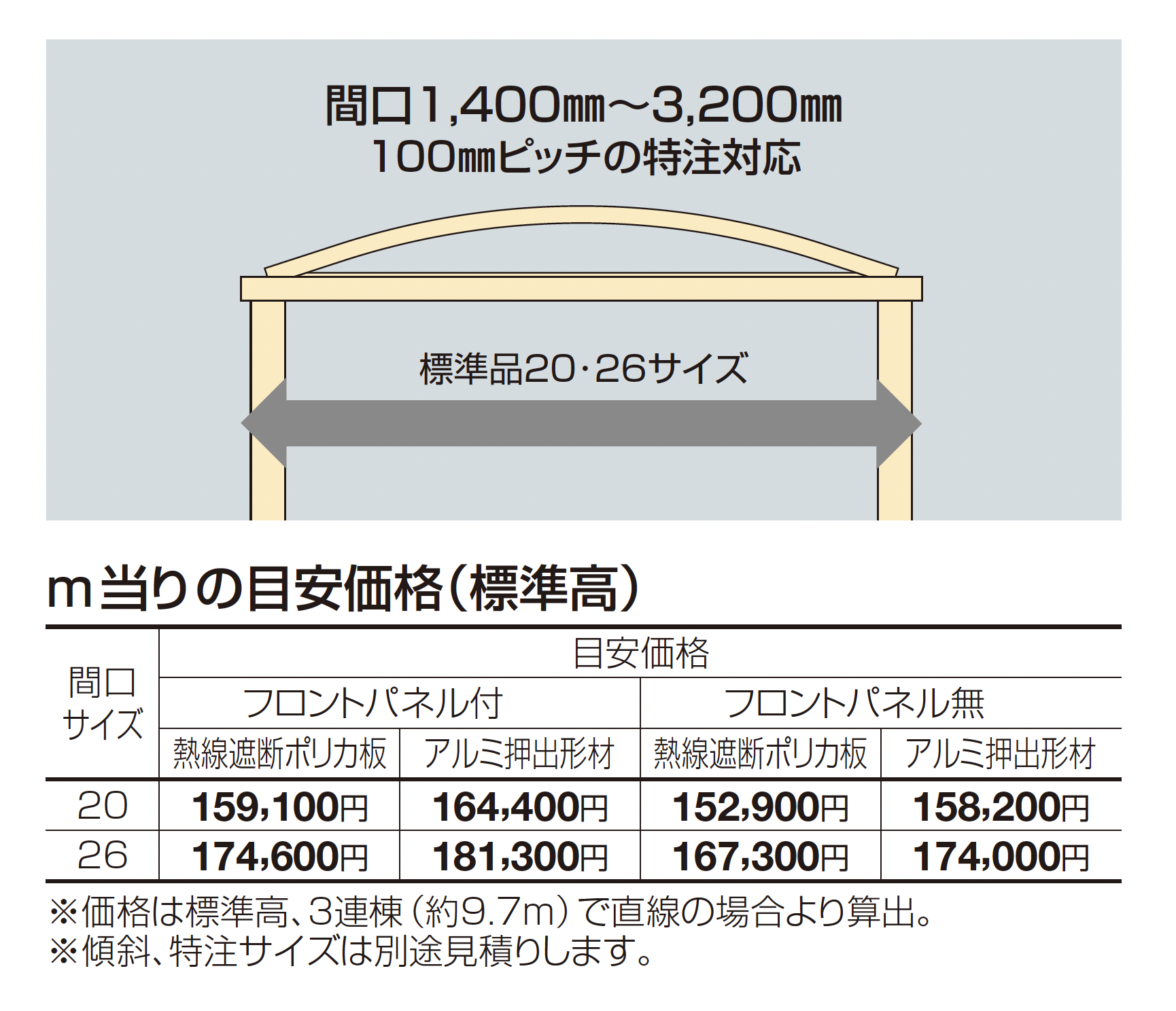 | 強度 | 風速Vo=34m/s 積雪荷重3000N/㎡ 積雪荷重4500N/㎡(特注) |