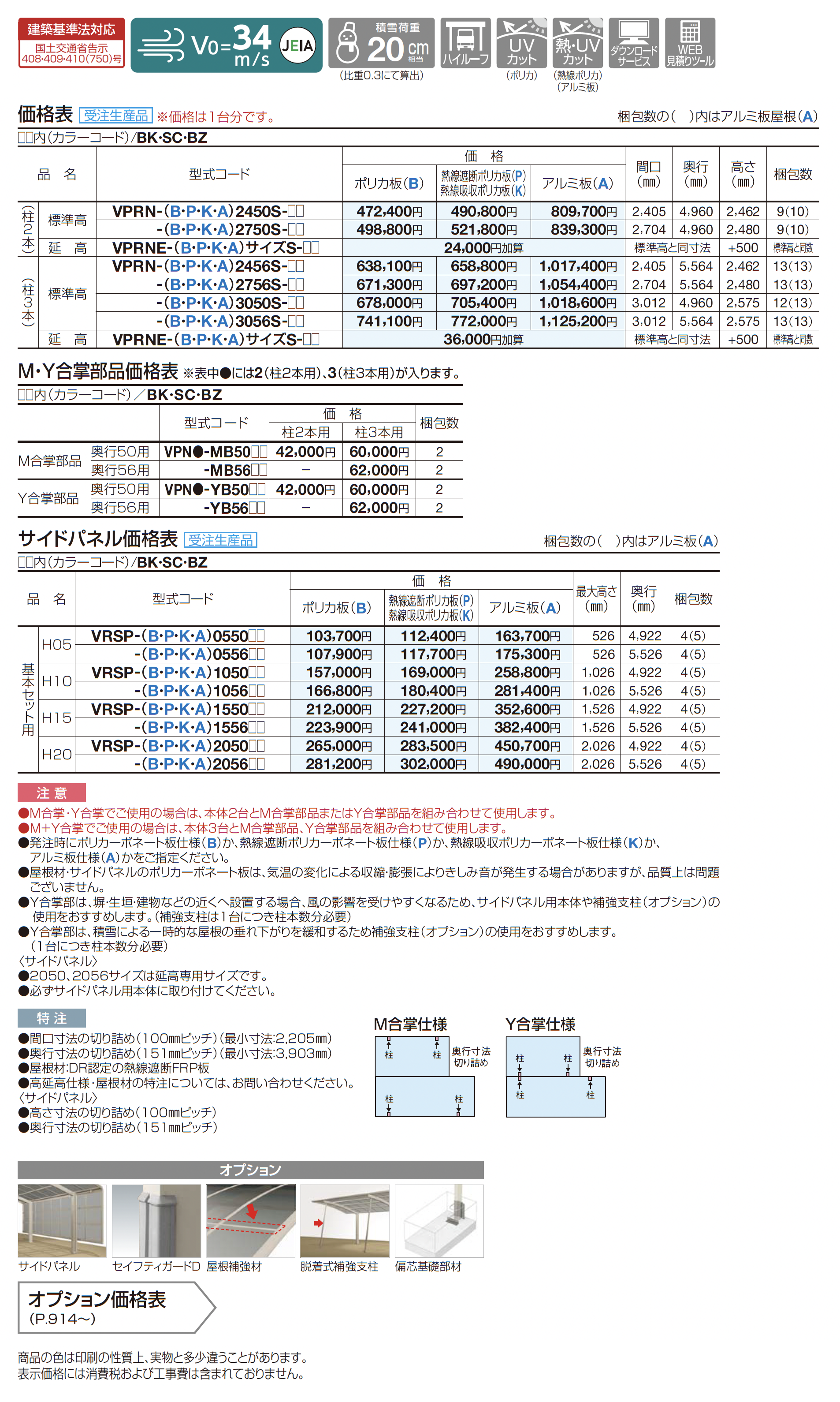| カラー | BK:ブラックつや消し SC:ステンカラー BZ:ブロンズ B:ポリカ板(グレースモーク) P:熱線遮断ポリカ板(グレースモーク) K:熱線吸収ポリカ板(クリア片面マット) A:アルミ板(不燃材)(ステンカラー) |