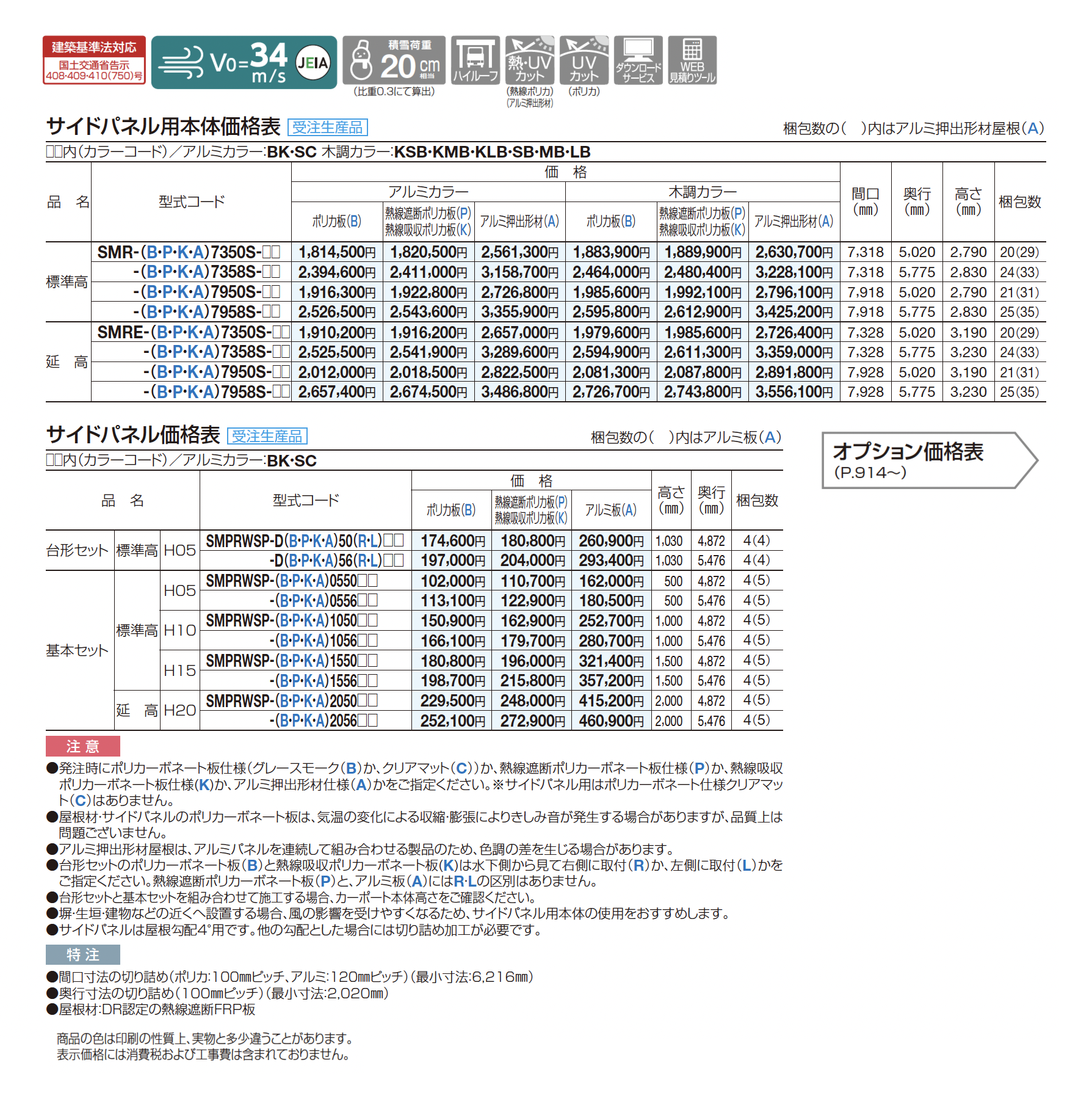 | カラー | BK:ブラックつや消し KSB:BK+セピアブラウン KMB:BK+マロンブラウン KLB:BK+ライトブラウン SC:ステンカラー SB:SC+セピアブラウン MB:SC+マロンブラウン LB:SC+ライトブラウン B:ポリカ板(グレースモーク) P:熱線遮断ポリカ板(グレースモーク) K:熱線吸収ポリカ板(クリア片面マット) A:アルミ板(不燃材) A:アルミ押出形材(不燃材) |