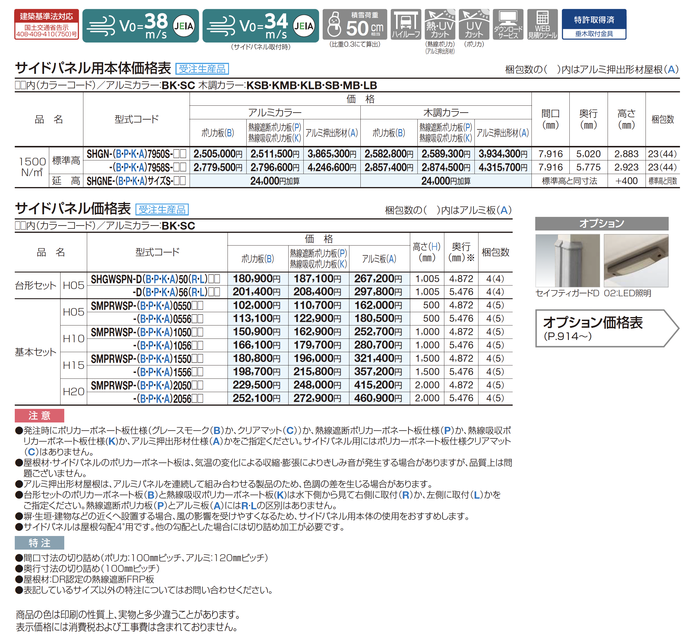 | カラー | SC:ステンカラー KSB:BK+セピアブラウン KMB:BK+マロンブラウン KLB:BK+ライトブラウン BK:ブラックつや消し SB:SC+セピアブラウン MB:SC+マロンブラウン LB:SC+ライトブラウン B:ポリカ板(グレースモーク) P:熱線遮断ポリカ板(グレースモーク) K:熱線吸収ポリカ板(クリア片面マット) A:アルミ押出形材(不燃材)(ステンカラー) A:アルミ板(不燃材)(ステンカラー) |