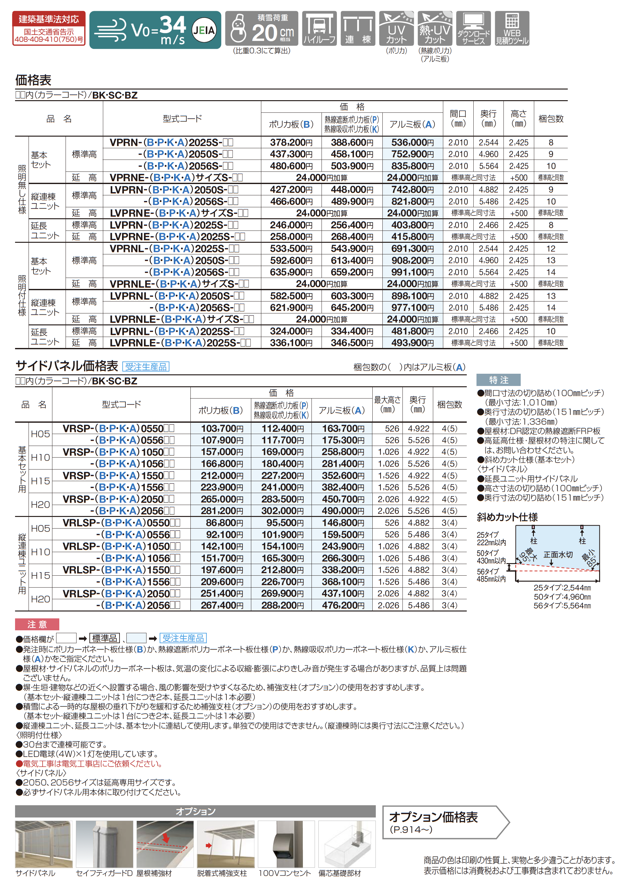 | カラー | BK:ブラックつや消し SC:ステンカラー BZ:ブロンズ B:ポリカ板(グレースモーク) P:熱線遮断ポリカ板(グレースモーク) K:熱線吸収ポリカ板(クリア片面マット) A:アルミ板(不燃材)(ステンカラー) |