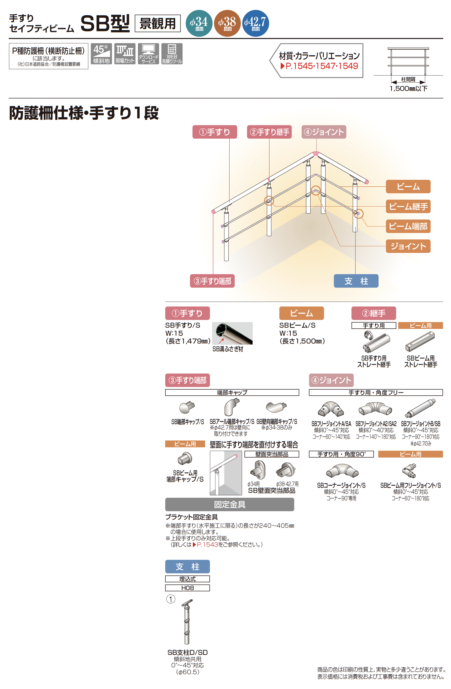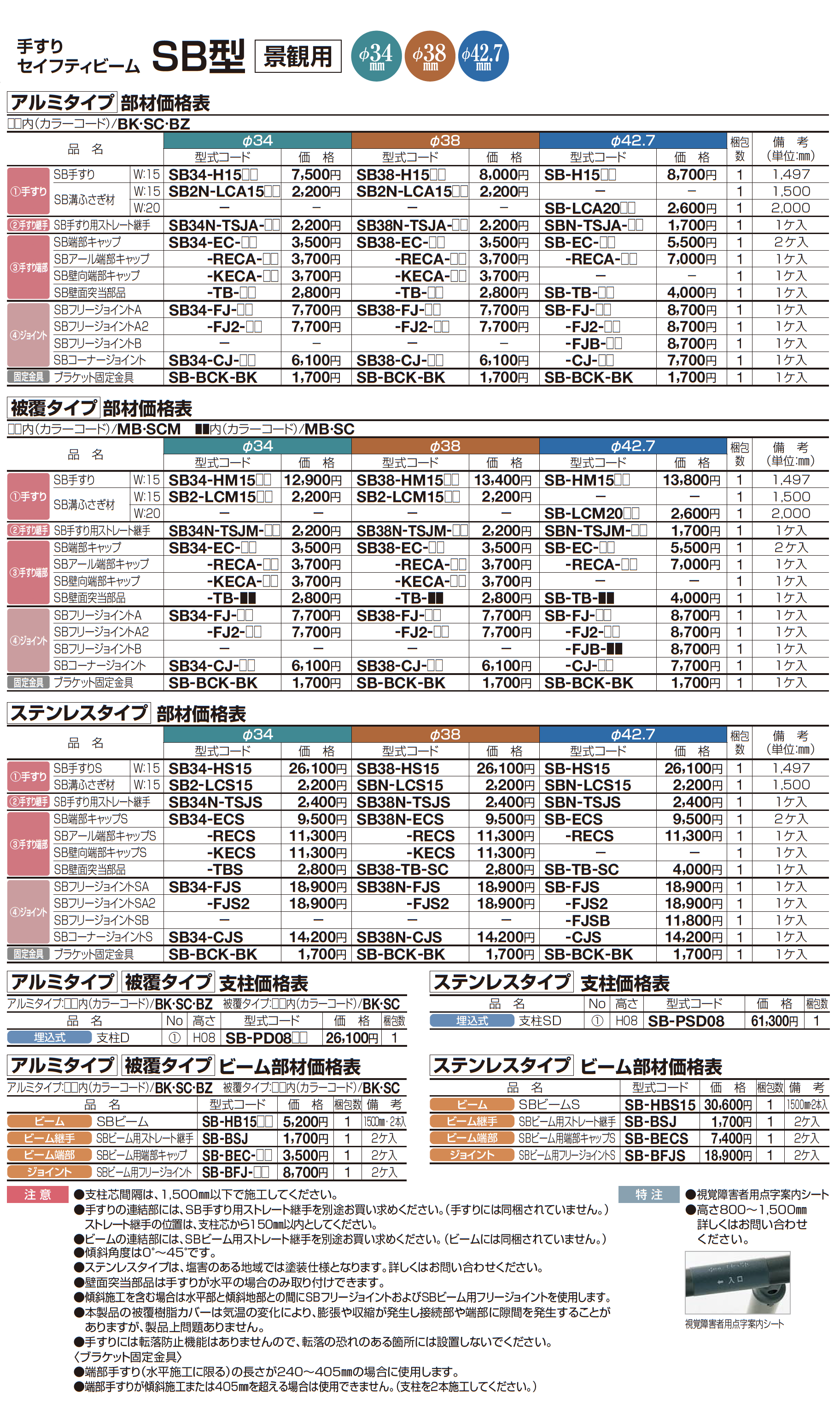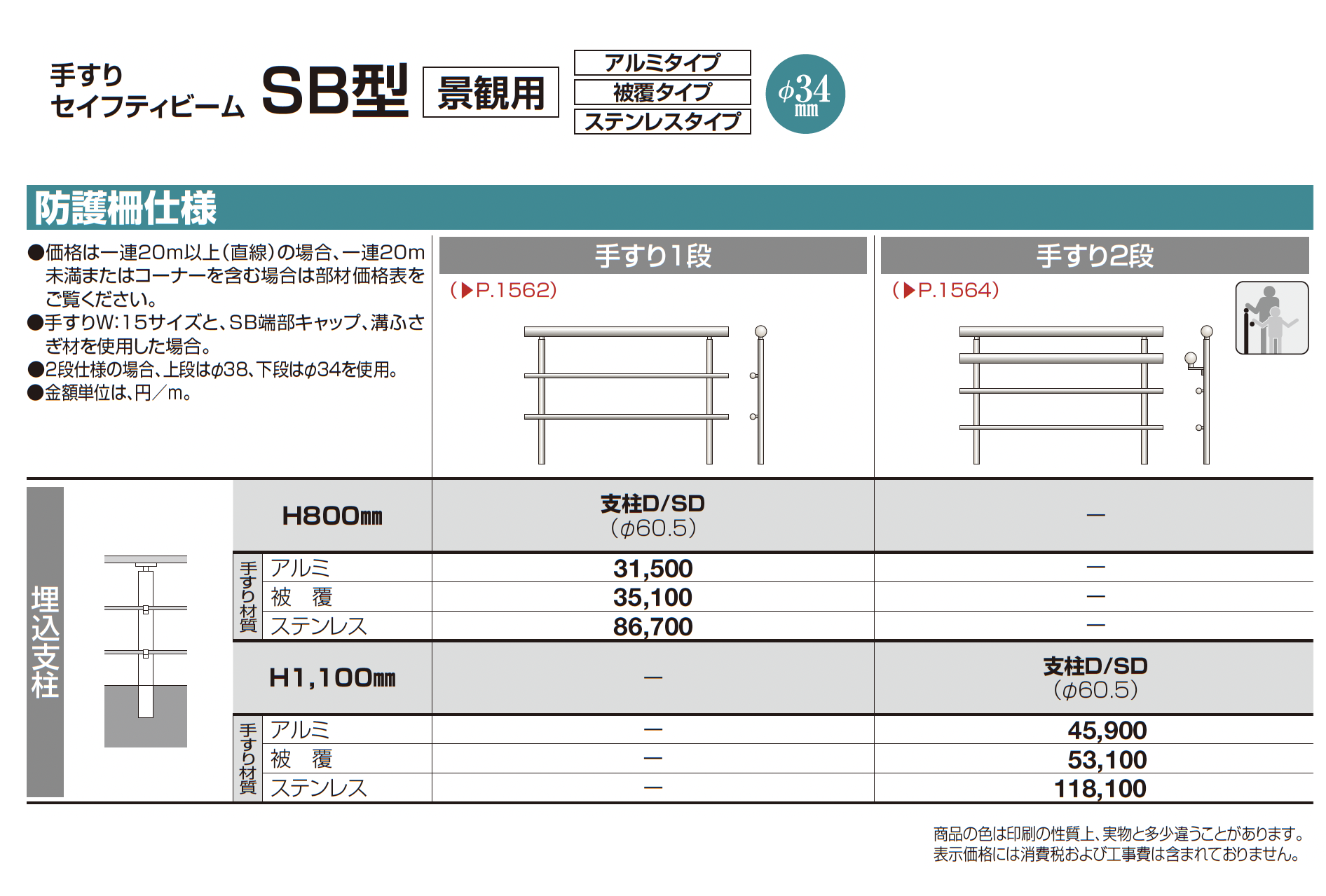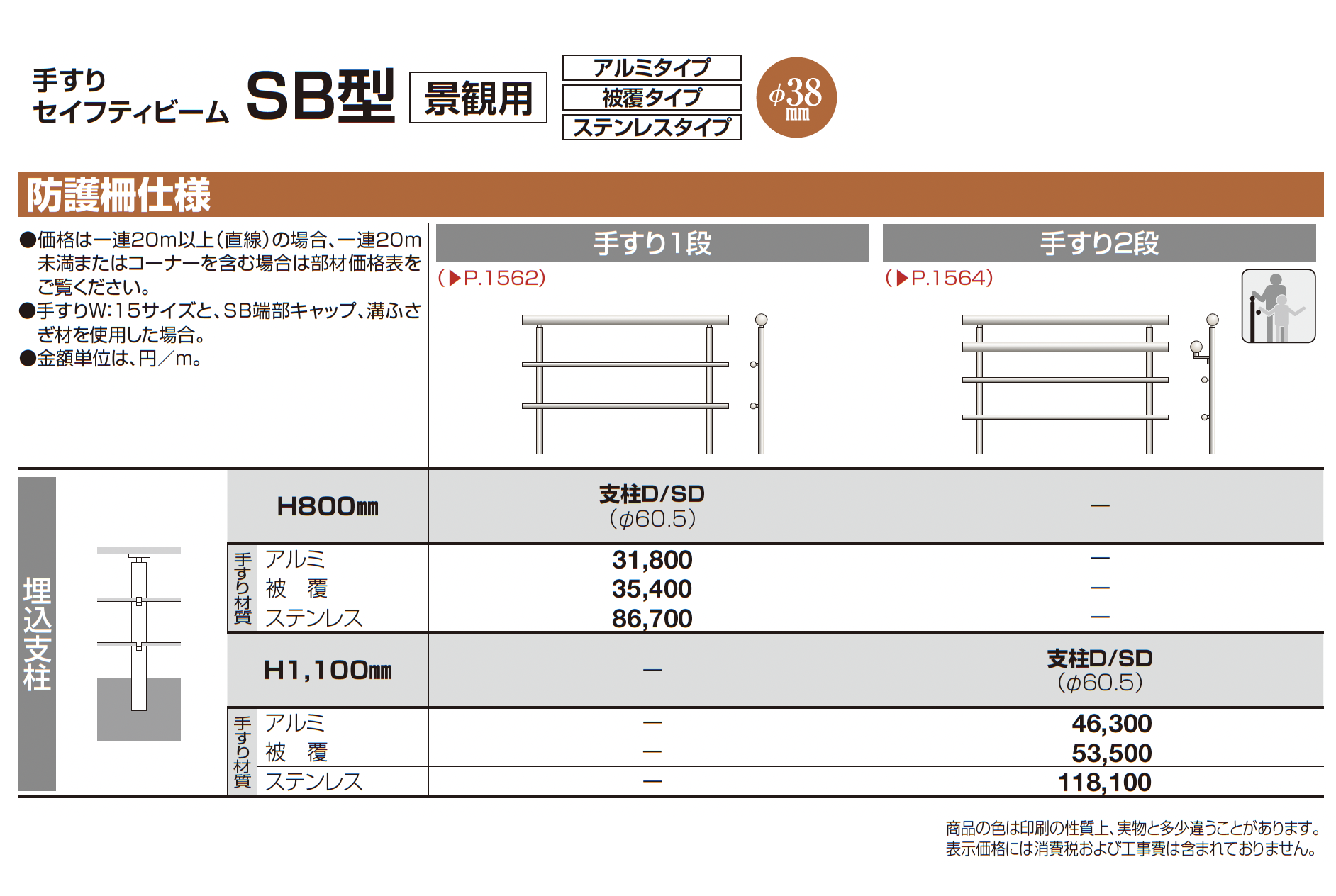 手すり セイフティビーム SB型 (アルミ・被覆・ステンレスタイプ)防護柵仕様・手すり1段【2024年版】(エクステリア総合カタログ 2024年度版)
