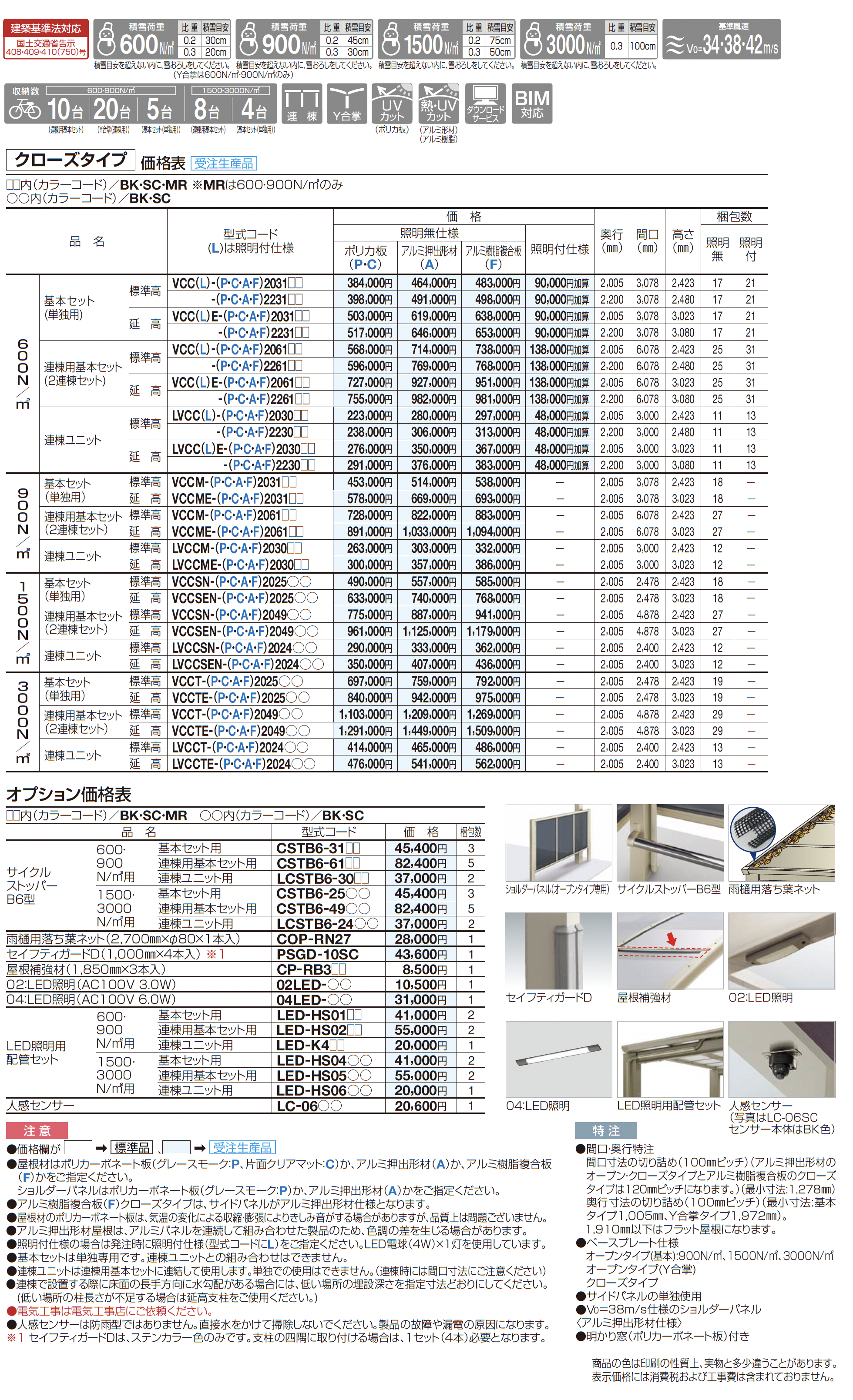 | カラー | BK:ブラックつや消し SC:ステンカラー MR:マットブラウン P:ポリカ板(グレースモーク) C:ポリカ板(クリアマット) A:アルミ押出形材(不燃材)(ステンカラー) F:アルミ樹脂複合板(不燃材)(ステンカラー) 熱線遮断ポリカ板(グレースモーク) |