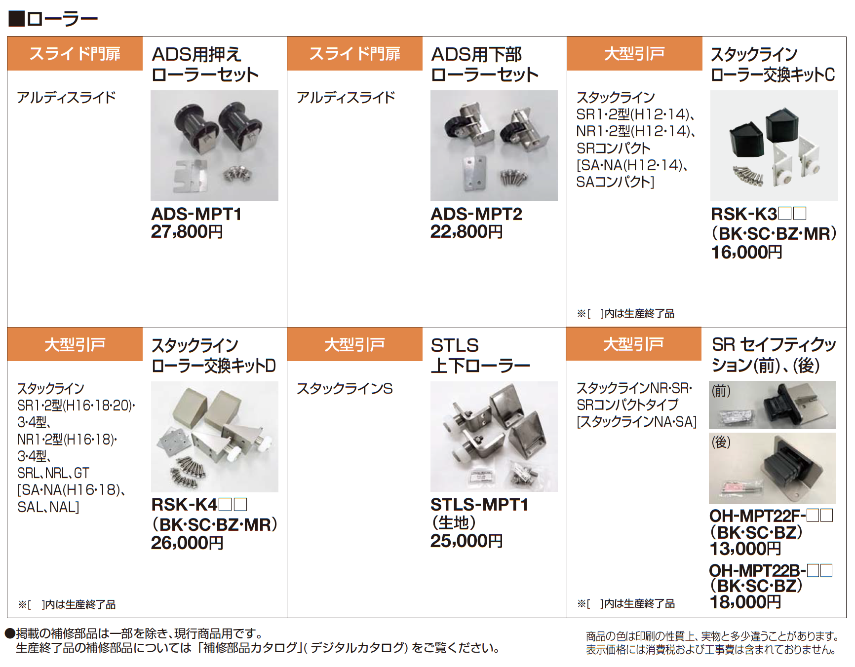 | 新旧品 | 補修部品 ローラー【2025年版】(エクステリア総合カタログ 2025年度版)ローラー 大型引戸用【2024年版】(エクステリア総合カタログ 2024年度版)大型引戸【2023年版】(エクステリア総合カタログ 2023年度版) |