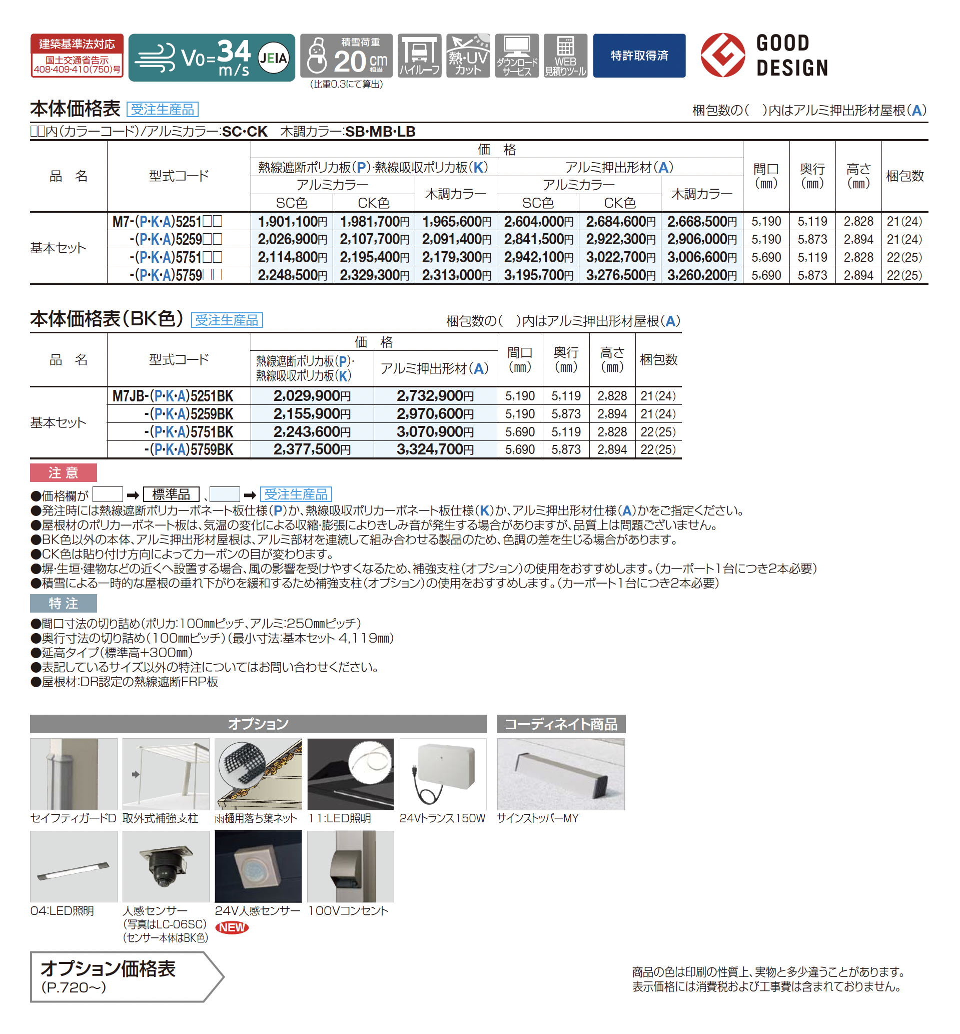 | カラー | BK:ブラックつや消し SC:ステンカラー CK:SC+カーボンブラック SB:SC+セピアブラウン MB:SC+マロンブラウン LB:SC+ライトブラウン P:熱線遮断ポリカ板(グレースモーク) K:熱線吸収ポリカ板(クリア片面マット) A:アルミ押出形材(不燃材)(ステンカラー) |