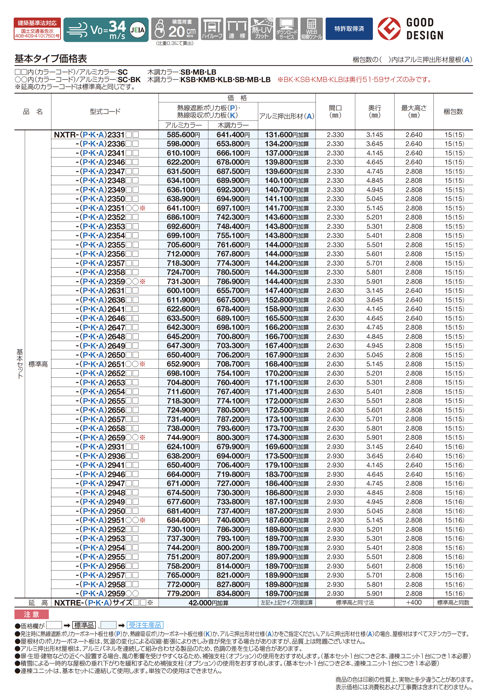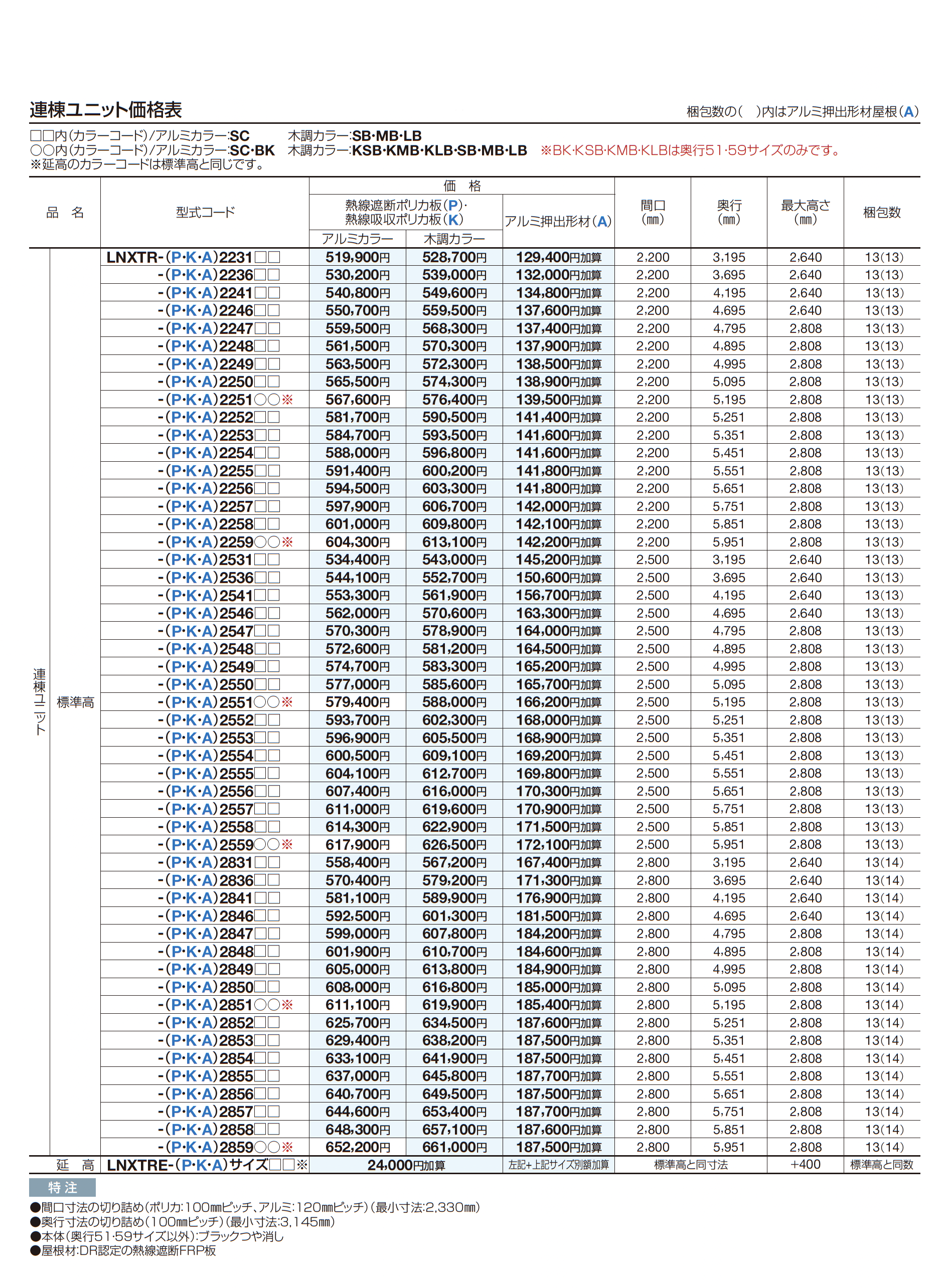| カラー | BK:ブラックつや消し(奥行51・59のみ) SC:ステンカラー KSB:BK+セピアブラウン(奥行51・59のみ) KMB:BK+マロンブラウン(奥行51・59のみ) KLB:BK+ライトブラウン(奥行51・59のみ) SB:SC+セピアブラウン MB:SC+マロンブラウン LB:SC+ライトブラウン P:熱線遮断ポリカ板(グレースモーク) K:熱線吸収ポリカ板(クリア片面マット) A:アルミ押出形材(不燃材)(ステンカラー) |