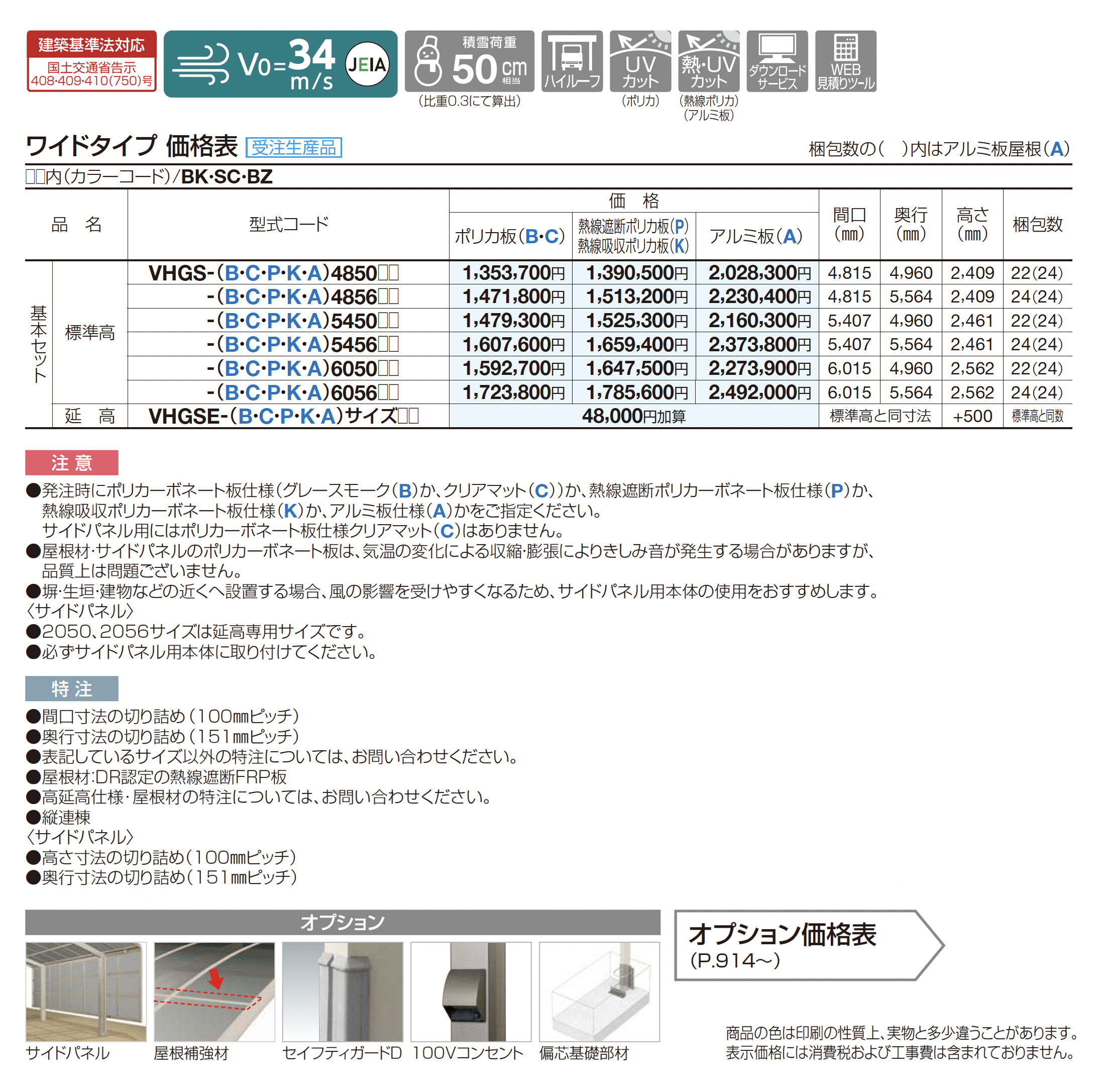 | カラー | BK:ブラックつや消し SC:ステンカラー BZ:ブロンズ B:ポリカ板(グレースモーク) C:ポリカ板(クリアマット) P:熱線遮断ポリカ板(グレースモーク) K:熱線吸収ポリカ板(クリア片面マット) A:アルミ板(不燃材)(ステンカラー) |