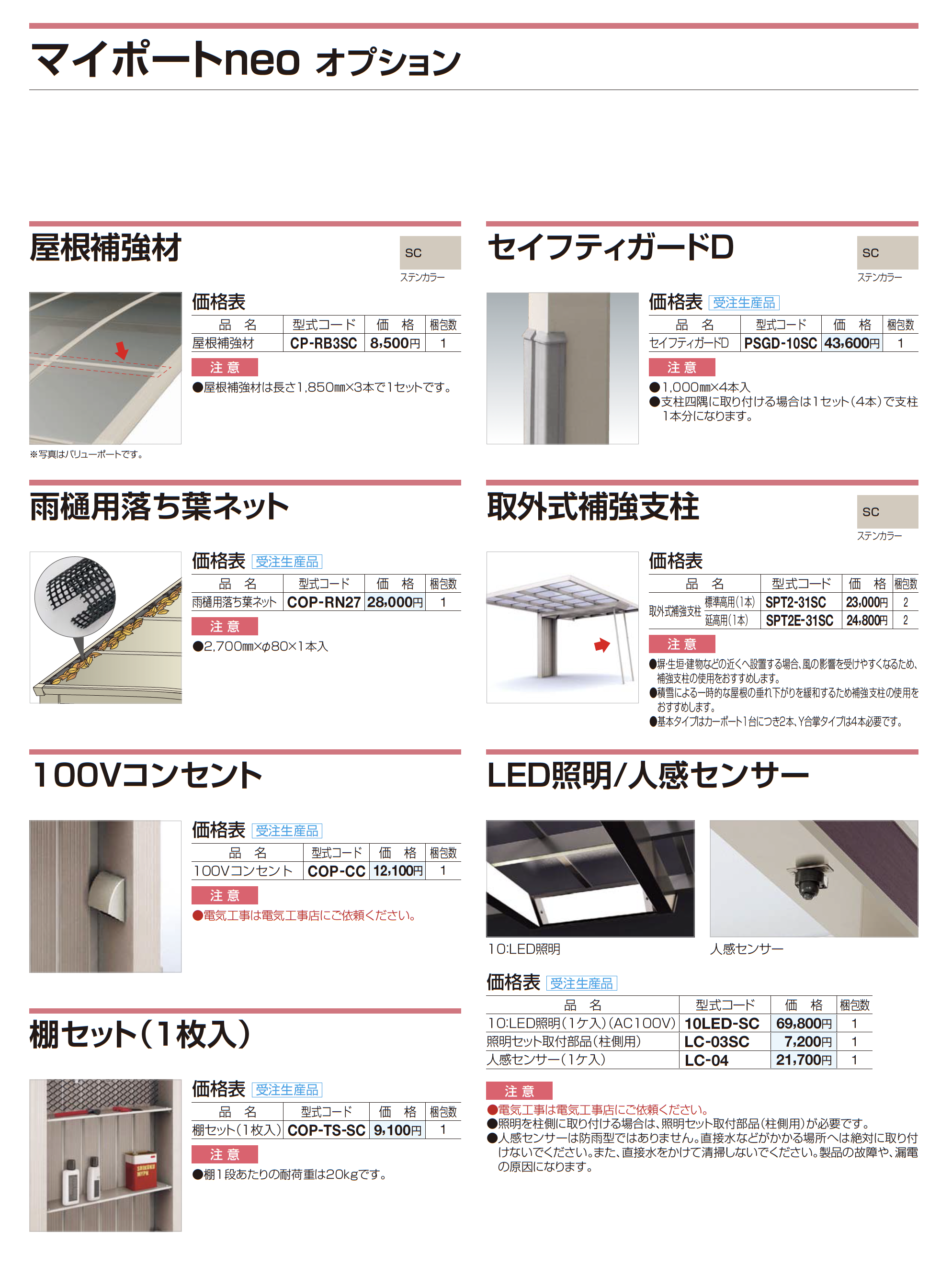| カラー | SC:ステンカラー SB:SC+セピアブラウン MB:SC+マロンブラウン LB:SC+ライトブラウン P:熱線遮断ポリカ板(グレースモーク) K:熱線吸収ポリカ板(クリア片面マット) A:アルミ板(不燃材)(ステンカラー) |