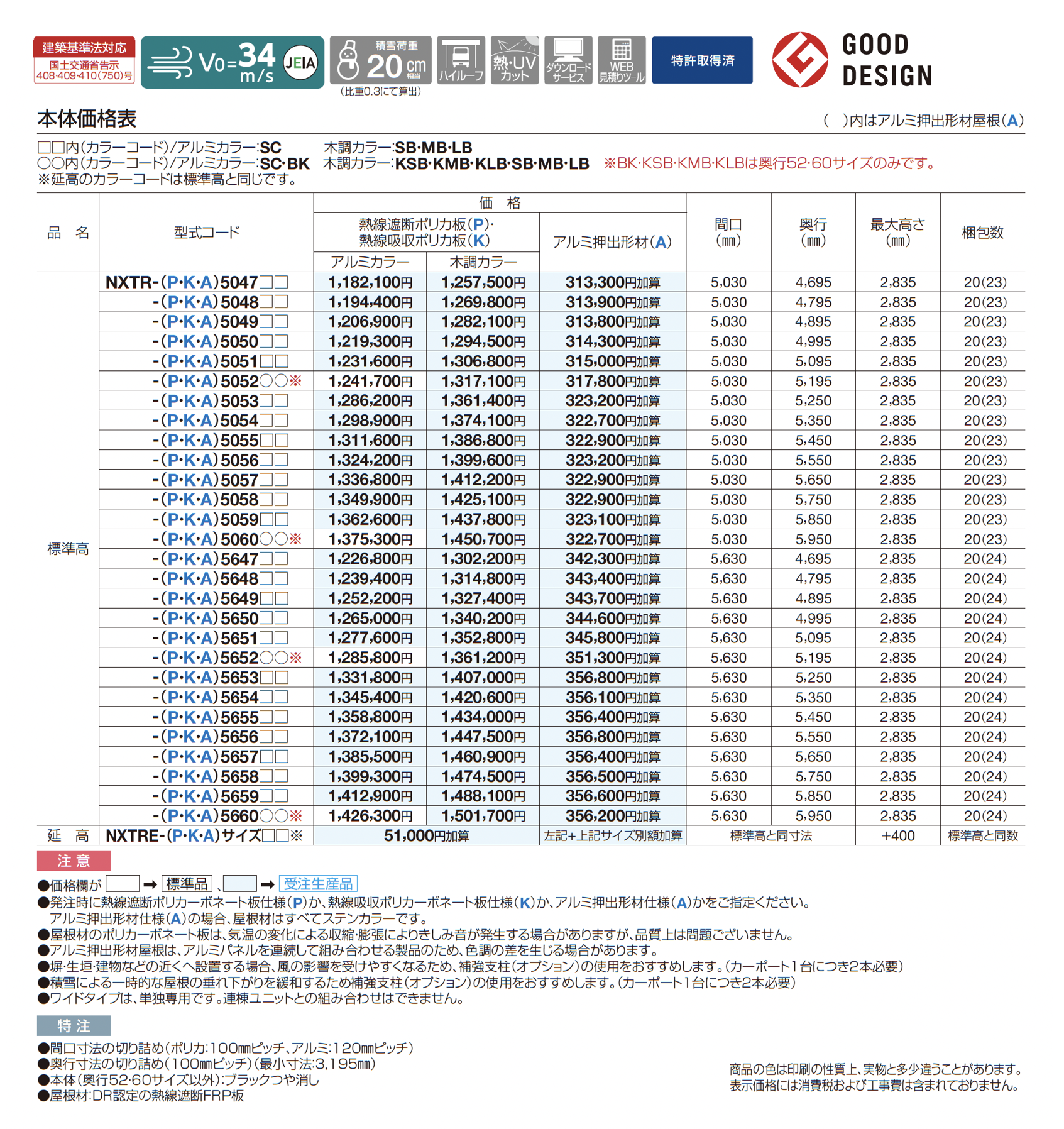 | カラー | BK:ブラックつや消し(奥行52・60のみ) SC:ステンカラー KSB:BK+セピアブラウン(奥行52・60のみ) KMB:BK+マロンブラウン(奥行52・60のみ) KLB:BK+ライトブラウン(奥行52・60のみ) SB:SC+セピアブラウン MB:SC+マロンブラウン LB:SC+ライトブラウン P:熱線遮断ポリカ板(グレースモーク) K:熱線吸収ポリカ板(クリア片面マット) A:アルミ押出形材(不燃材)(ステンカラー) |
