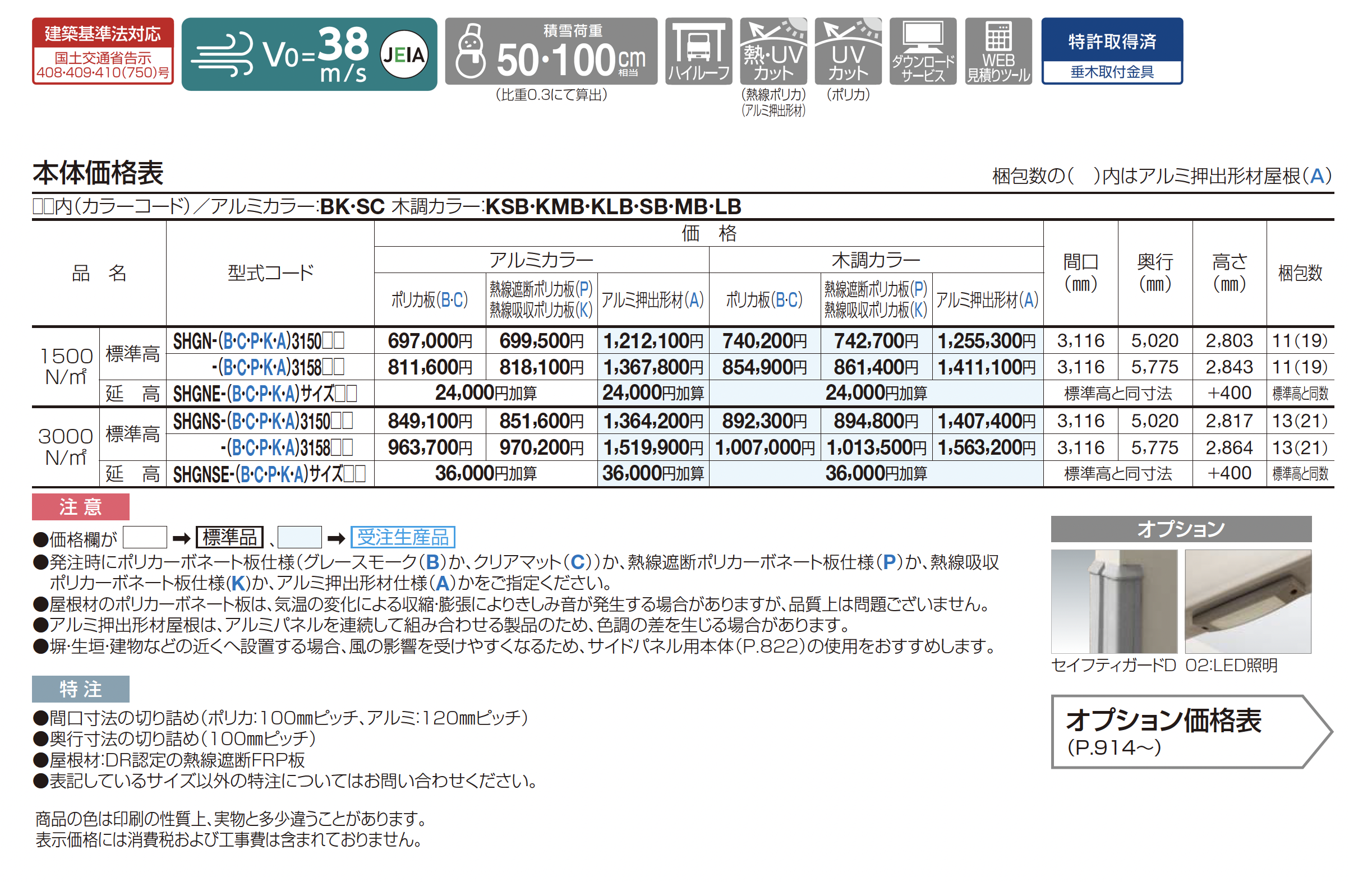 | カラー | BK:ブラックつや消し KSB:BK+セピアブラウン KMB:BK+マロンブラウン KLB:BK+ライトブラウン SC:ステンカラー SB:SC+セピアブラウン MB:SC+マロンブラウン LB:SC+ライトブラウン B:ポリカ板(グレースモーク) C:ポリカ板(クリアマット) P:熱線遮断ポリカ板(グレースモーク) K:熱線吸収ポリカ板(クリア片面マット) A:アルミ押出形材(不燃材)(ステンカラー) |