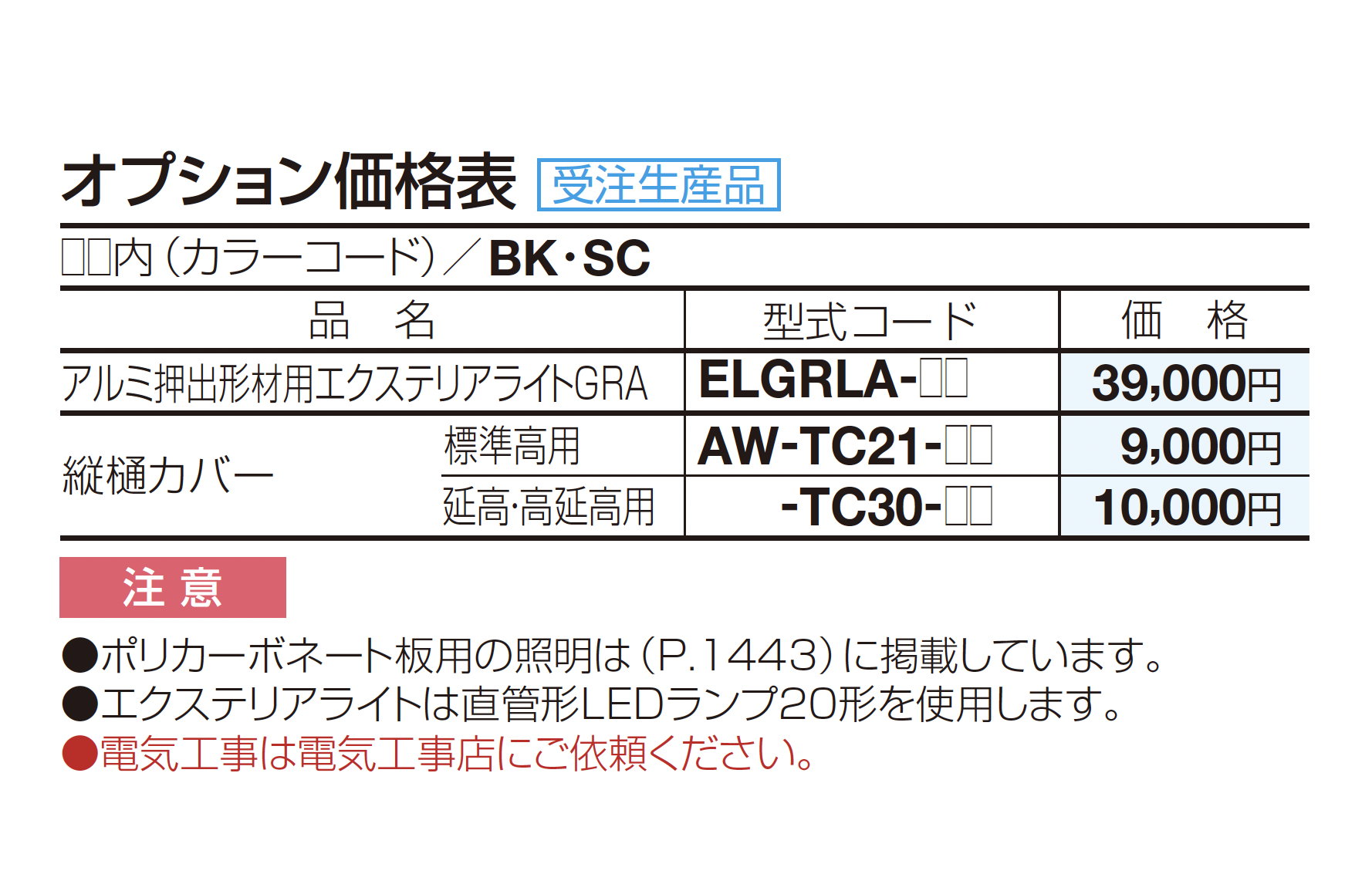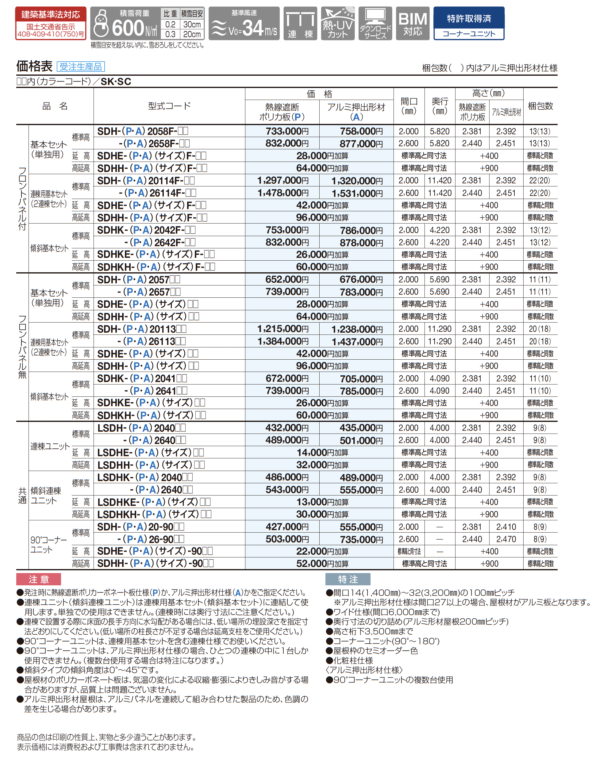 | カラー | SK:ブラックつや消し+ステンカラー SC:ステンカラー P:熱線遮断ポリカ板(グレースモーク) A:アルミ押出形材(不燃材)(ステンカラー) A:アルミ板(不燃材)(ステンカラー) |
