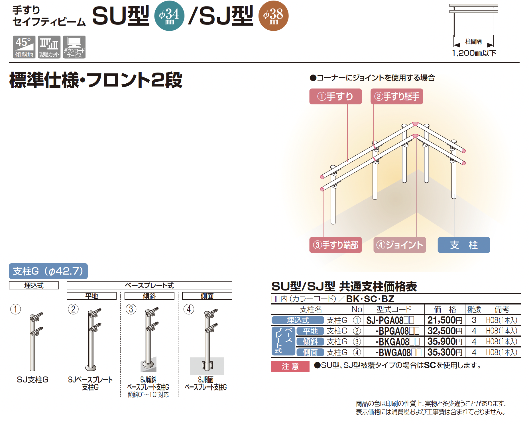 手すり セイフティビーム SU型Φ34mm / SJ型Φ38mm標準仕様・フロント2段【2025年版】(エクステリア総合カタログ 2025年度版)