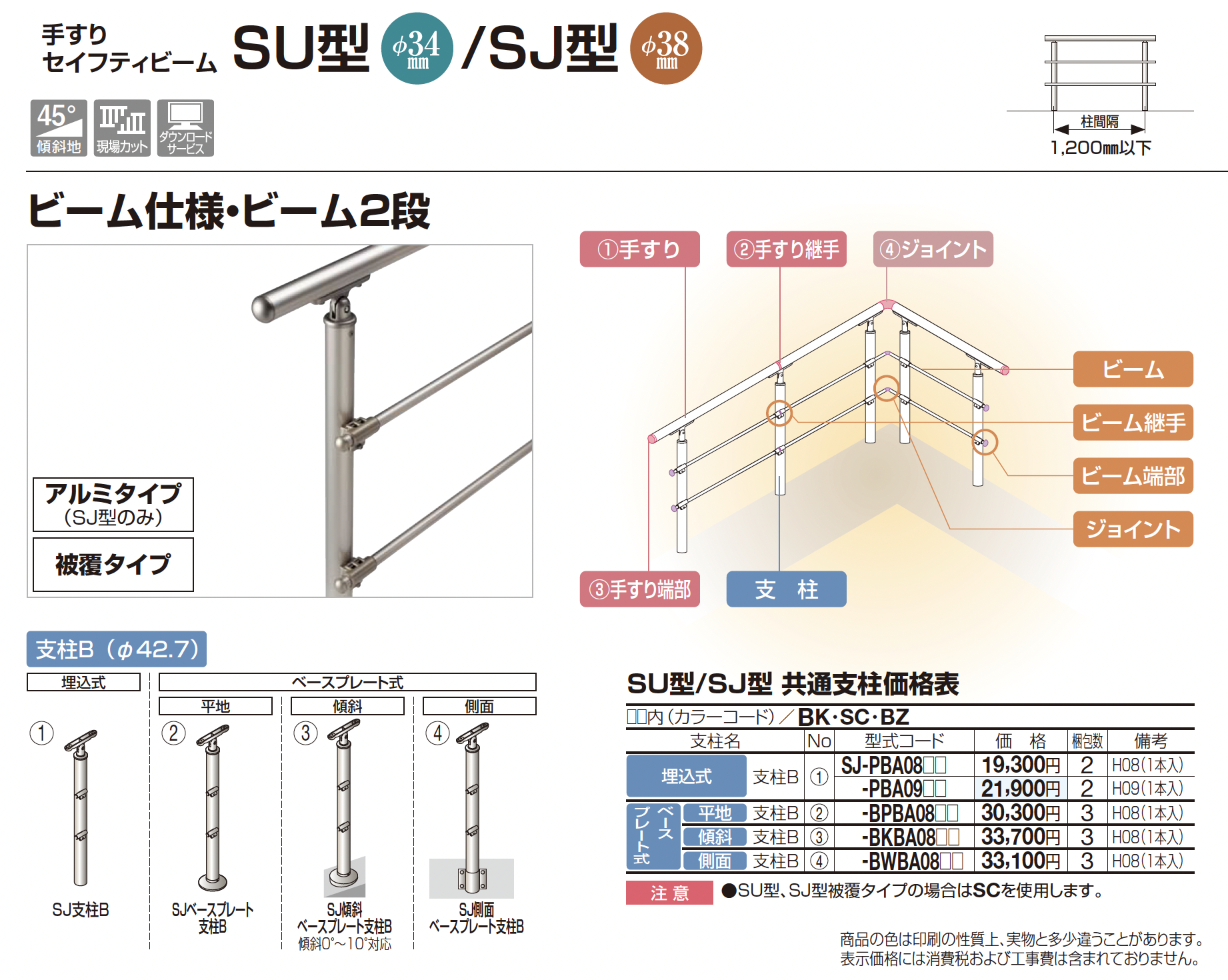 手すり セイフティビーム SU型Φ34mm / SJ型Φ38mm ビーム仕様・ビーム2段【2024年版】(エクステリア総合カタログ 2024年度版)