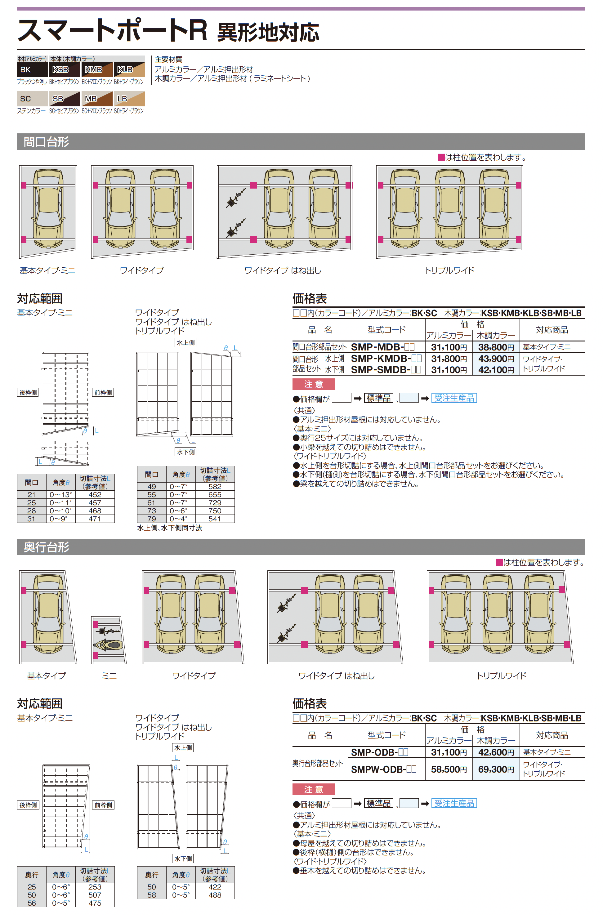 | カラー | BK:ブラックつや消し KSB:BK+セピアブラウン KMB:BK+マロンブラウン KLB:BK+ライトブラウン SC:ステンカラー SB:SC+セピアブラウン MB:SC+マロンブラウン LB:SC+ライトブラウン B:ポリカ板(グレースモーク) P:熱線遮断ポリカ板(グレースモーク) K:熱線吸収ポリカ板(クリア片面マット) A:アルミ板(不燃材)(ステンカラー) |
