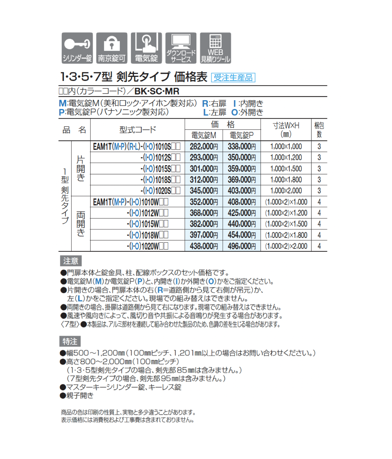 | 新旧品 | 門扉 EAM1型 剣先タイプ(電気錠仕様)【2024年版】(エクステリア総合カタログ 2024年度版)門扉 EAM1型 剣先タイプ(電気錠仕様)【2023年版】(エクステリア総合カタログ 2023年度版) |