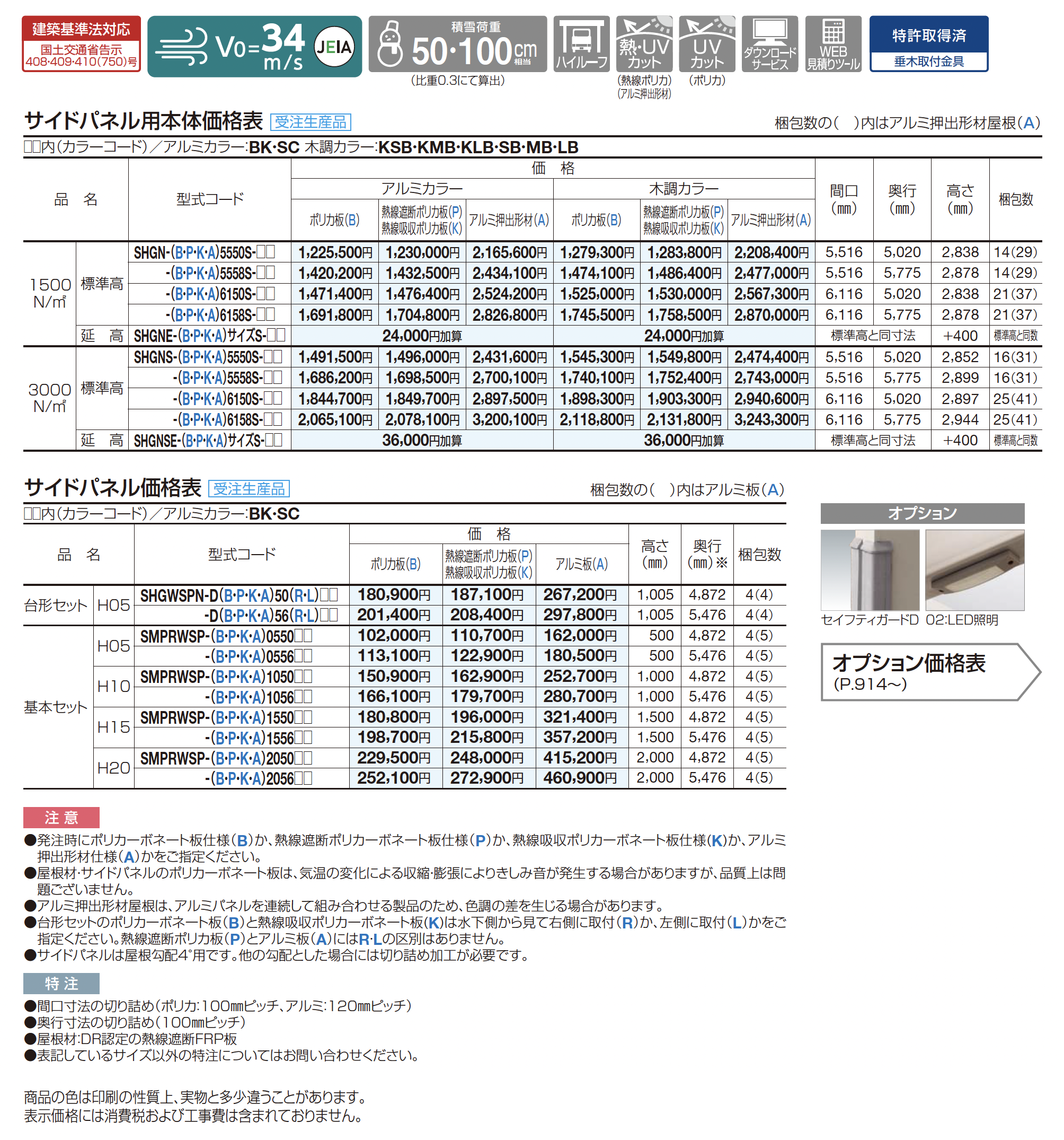 | カラー | BK:ブラックつや消し KSB:BK+セピアブラウン KMB:BK+マロンブラウン KLB:BK+ライトブラウン SC:ステンカラー SB:SC+セピアブラウン MB:SC+マロンブラウン LB:SC+ライトブラウン B:ポリカ板(グレースモーク) P:熱線遮断ポリカ板(グレースモーク) K:熱線吸収ポリカ板(クリア片面マット) A:アルミ押出形材(不燃材)(ステンカラー) A:アルミ板(不燃材)(ステンカラー) |